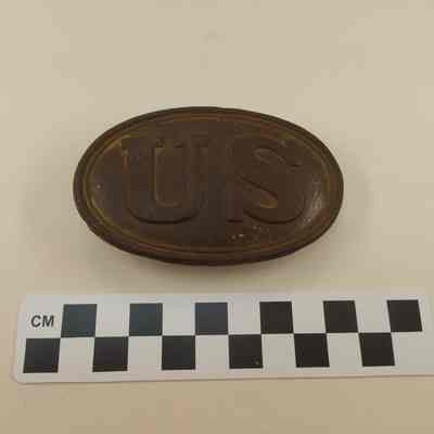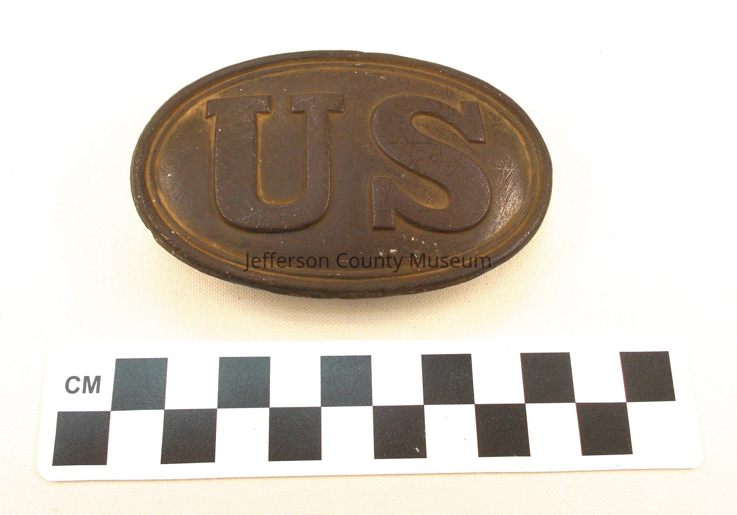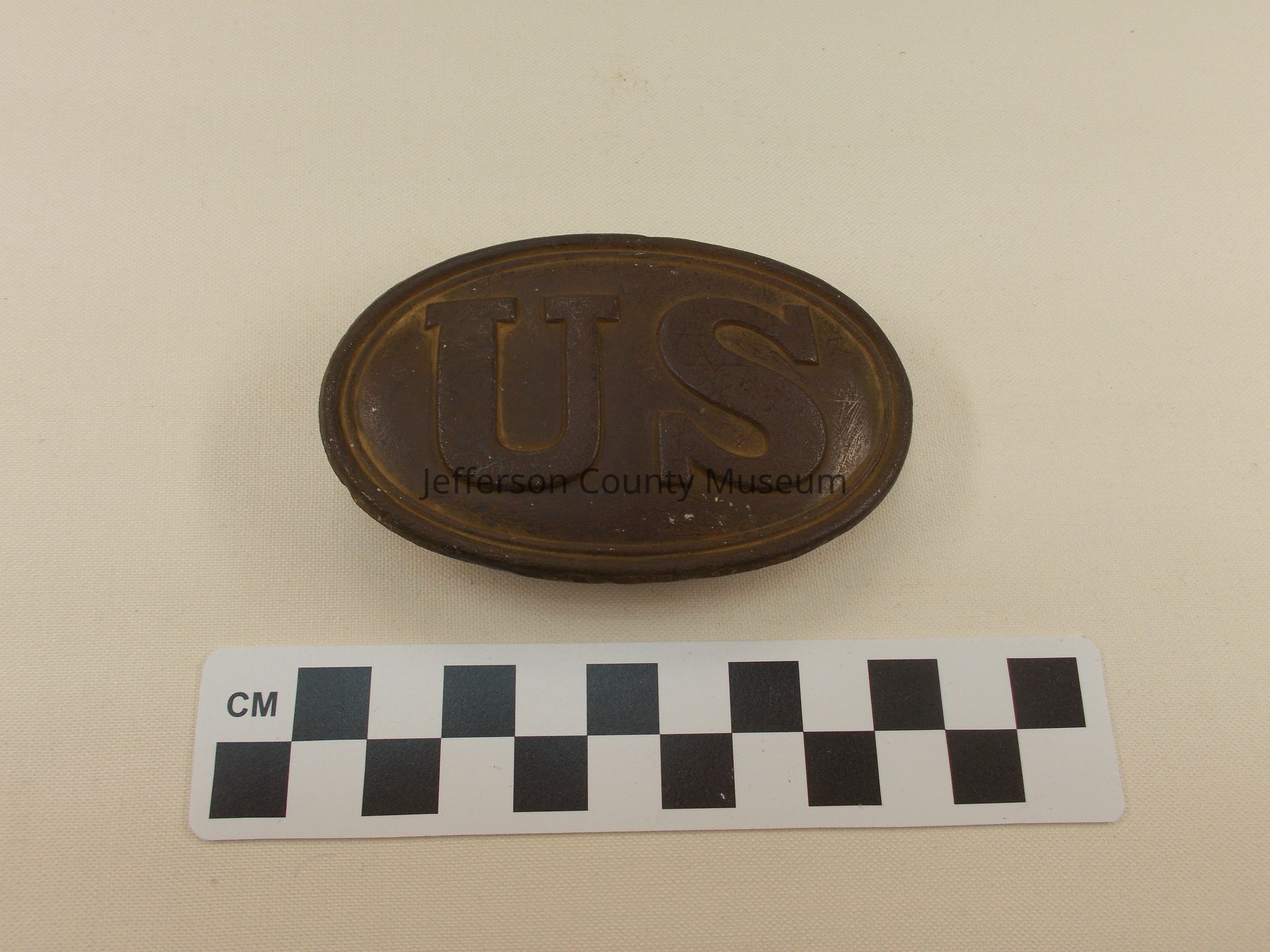 Brass oval U.S. belt plate with hook and two metal studs on back for attaching to belt.Acquisition