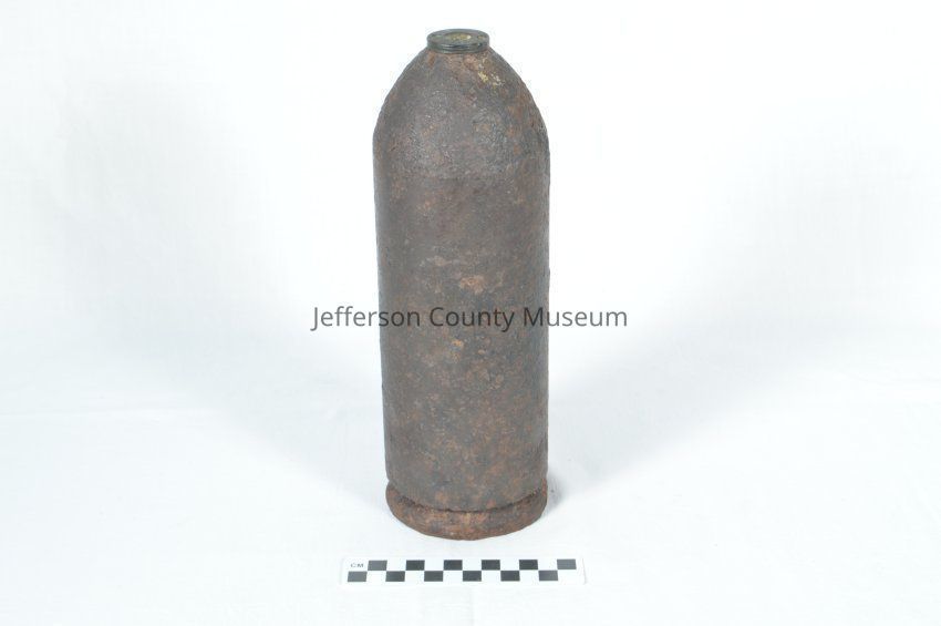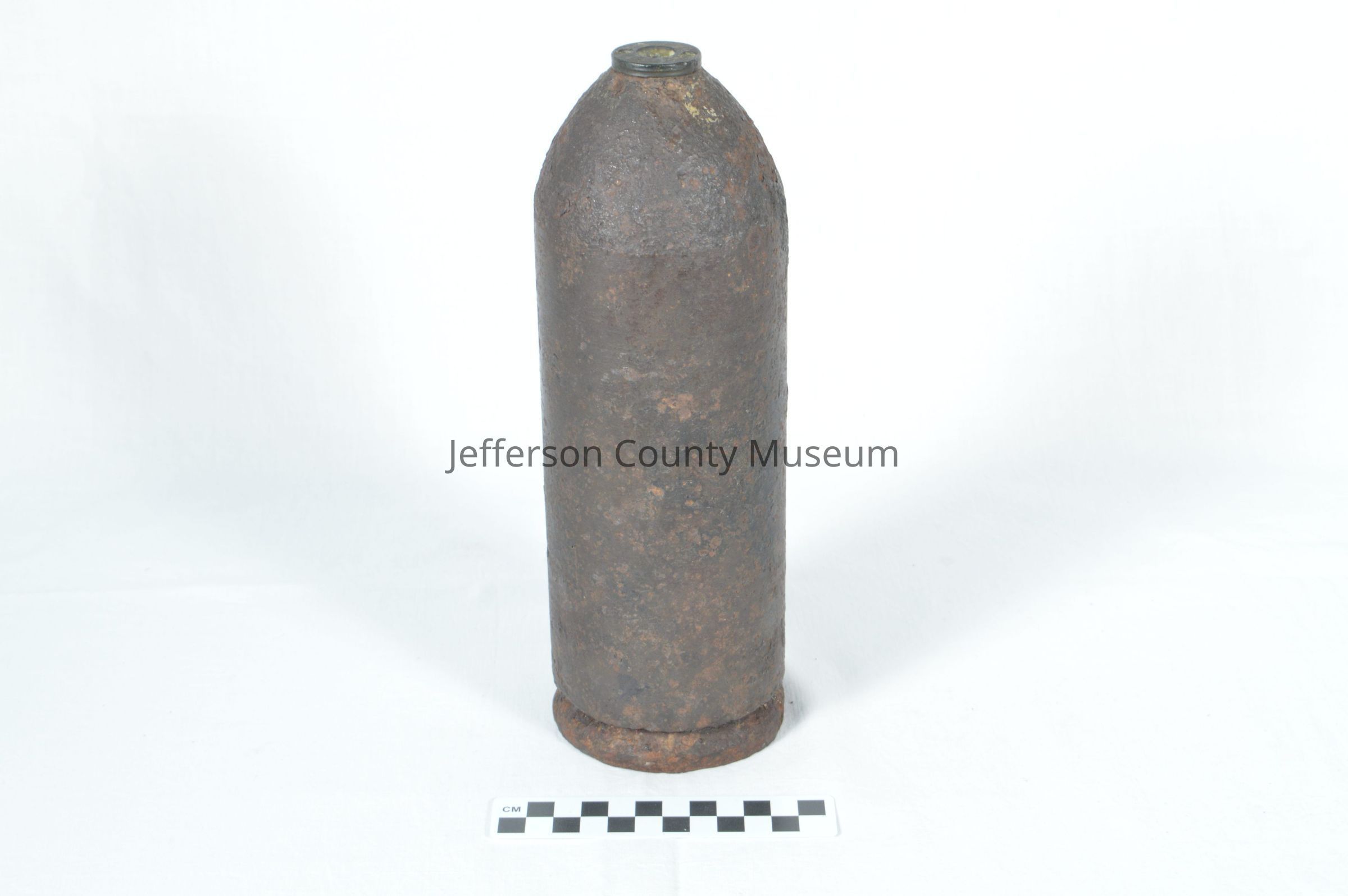 20-pound Parrott shell with fuse plug. Shell has been deactivated. Conical shape at top. Lip around bottom.Acquisition