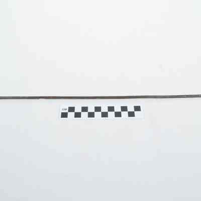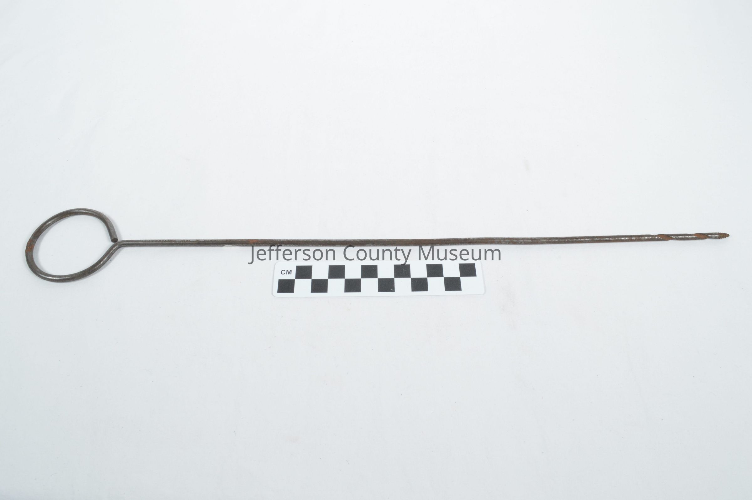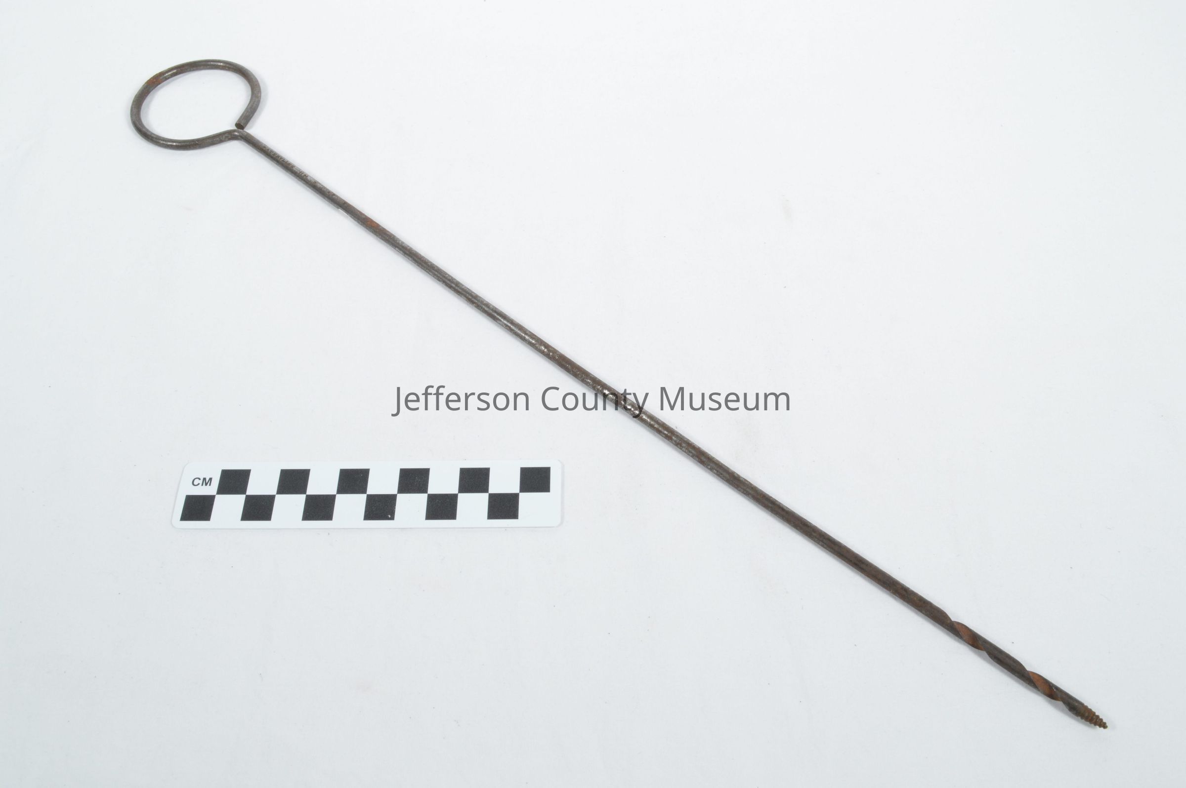 Metal pick with large ring at one end, threads and point at other end. Extending 5 cm. up from thread are drill bit grooves.Acquisition