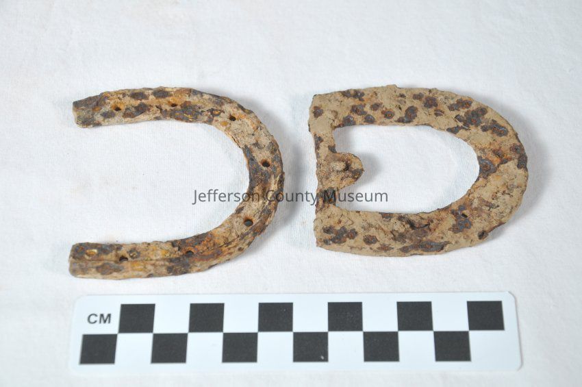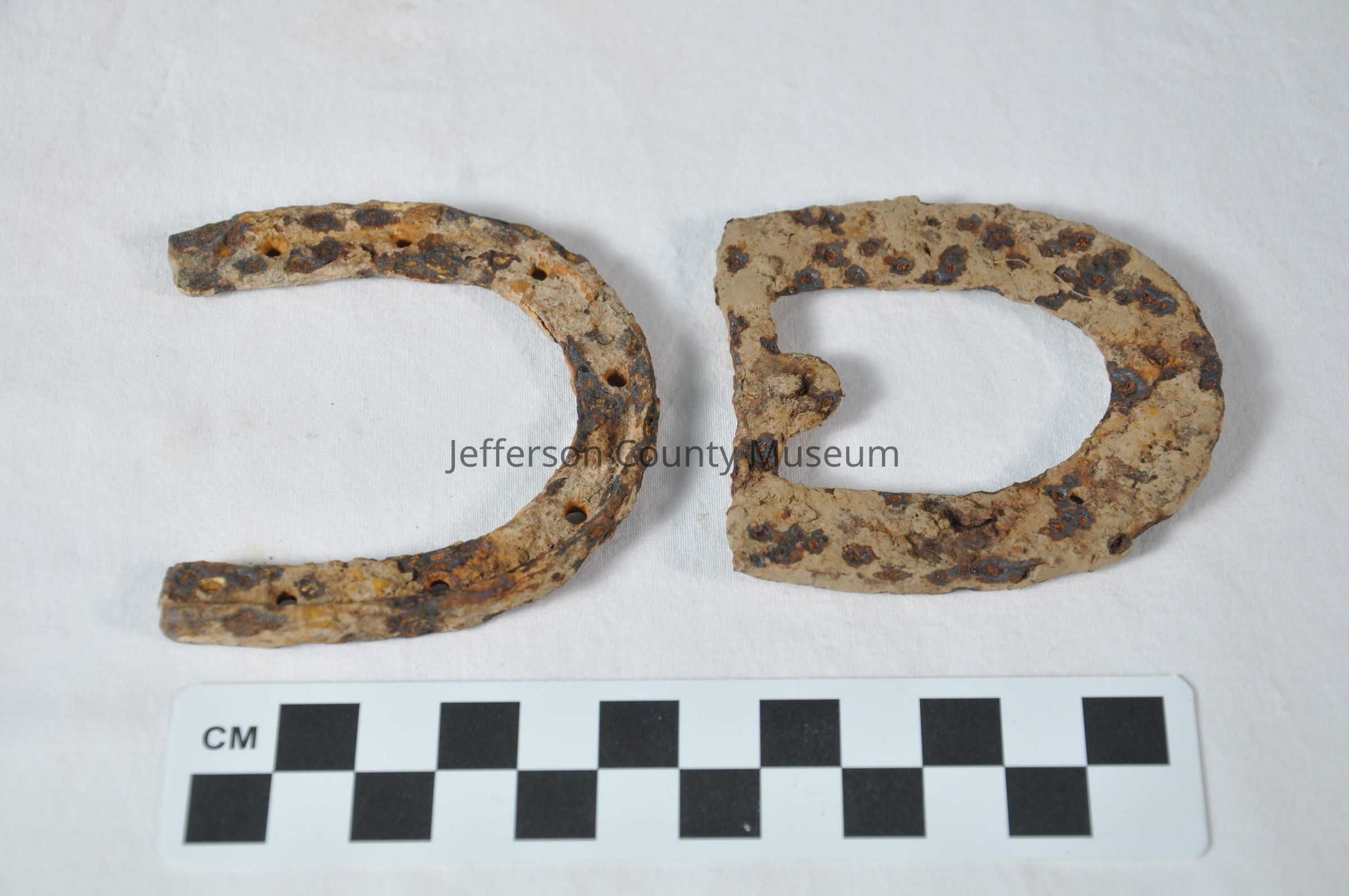 Two heel plates (a-b) from soldiers' shoes. Horseshoe shaped. One is C shaped (a) and one id D shaped (b). Excavated.Acquisition