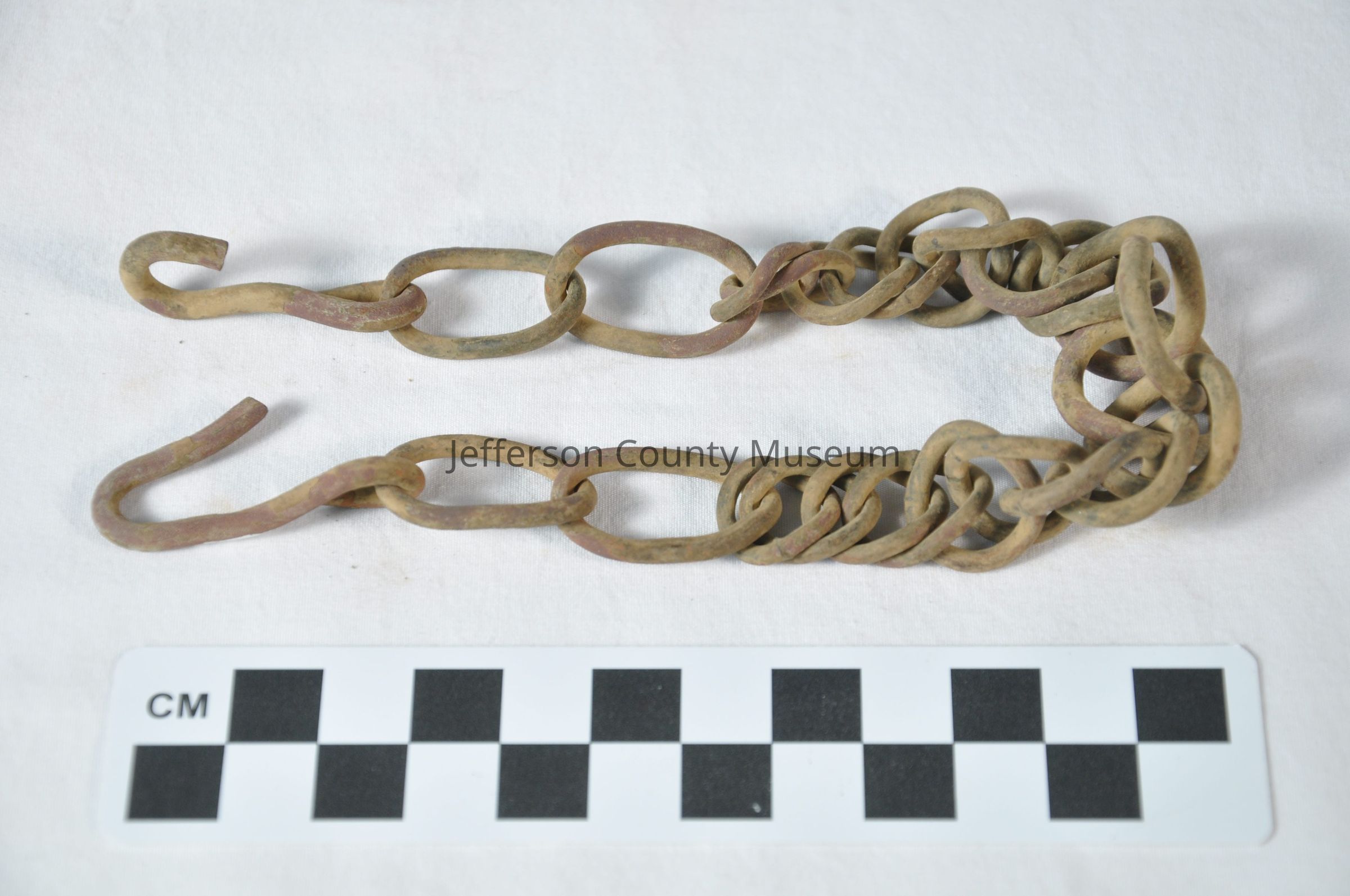 Curb bit chain. Hooks on each end. Has many interlocking links to form a chain.