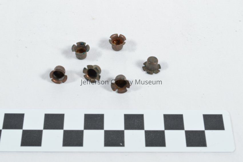 Six brass percussion caps (a-f) with 4-6 pieces extending from the open end.Acquisition
