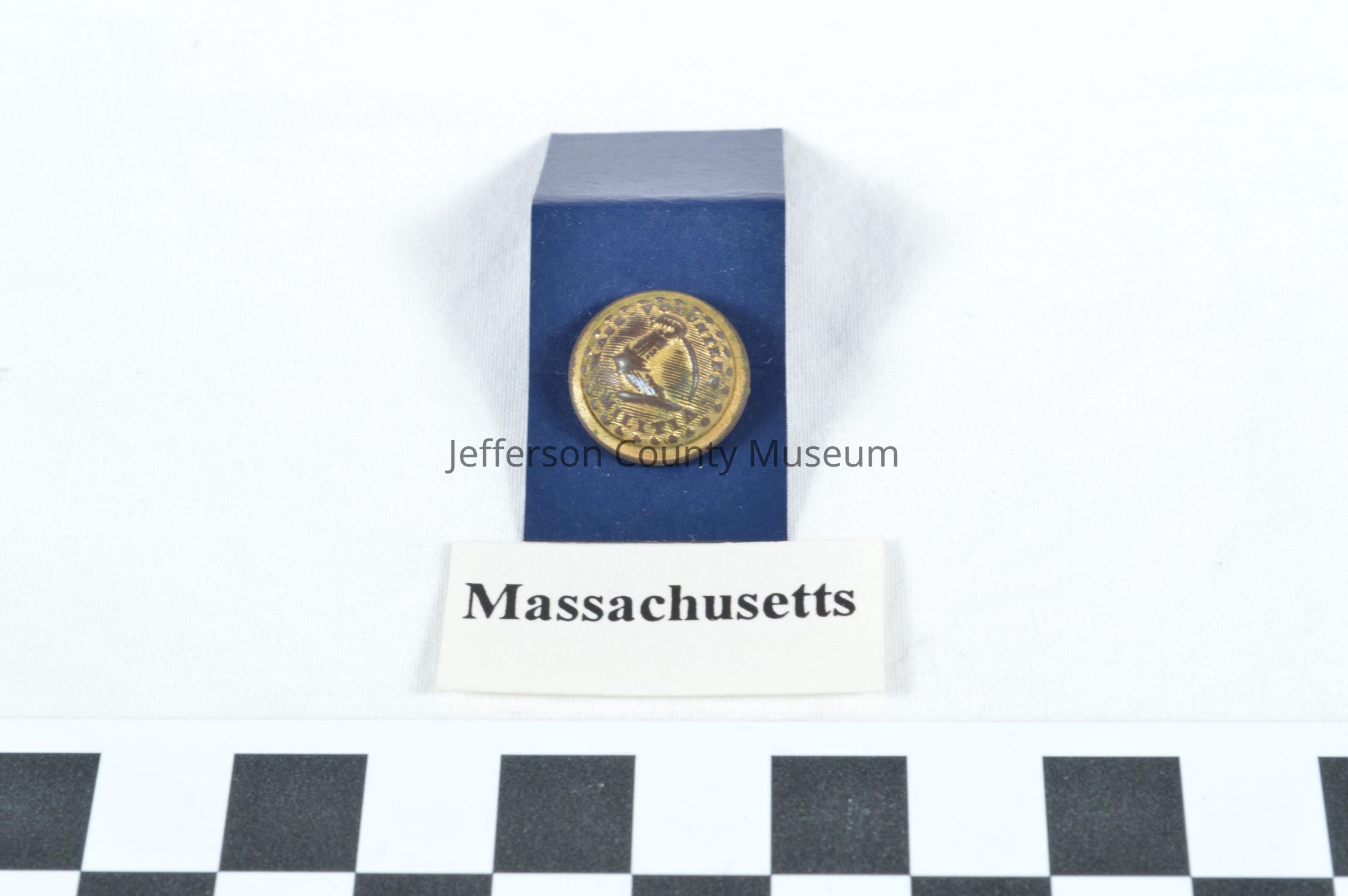 Massachusetts state seal arm and sword with "MASS. VOLUNTEER MILITIA" around. Loop on back. On back "D. EVANS & CO. EXTRA".Acquisition