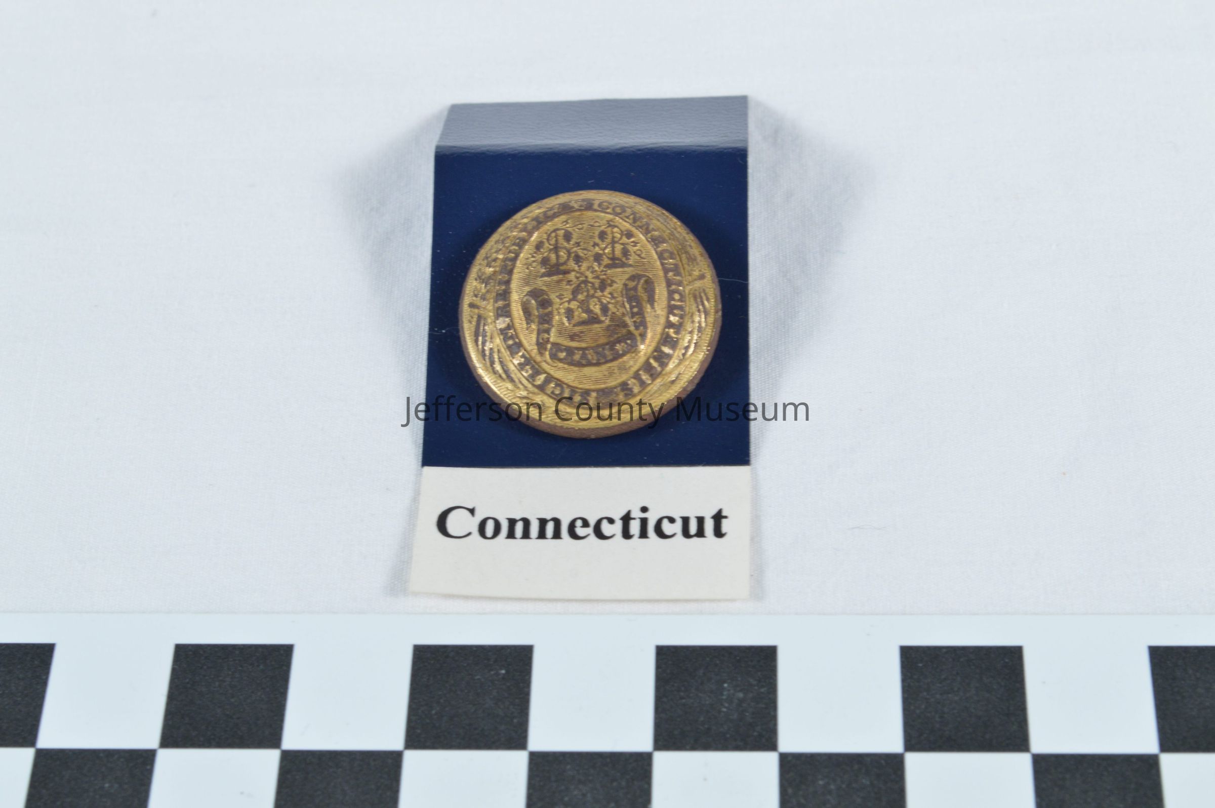 Connecticut button with state seal grape vine with Latin inscription "He who transplanted continues to sustain". Loop on back.Acquisition
