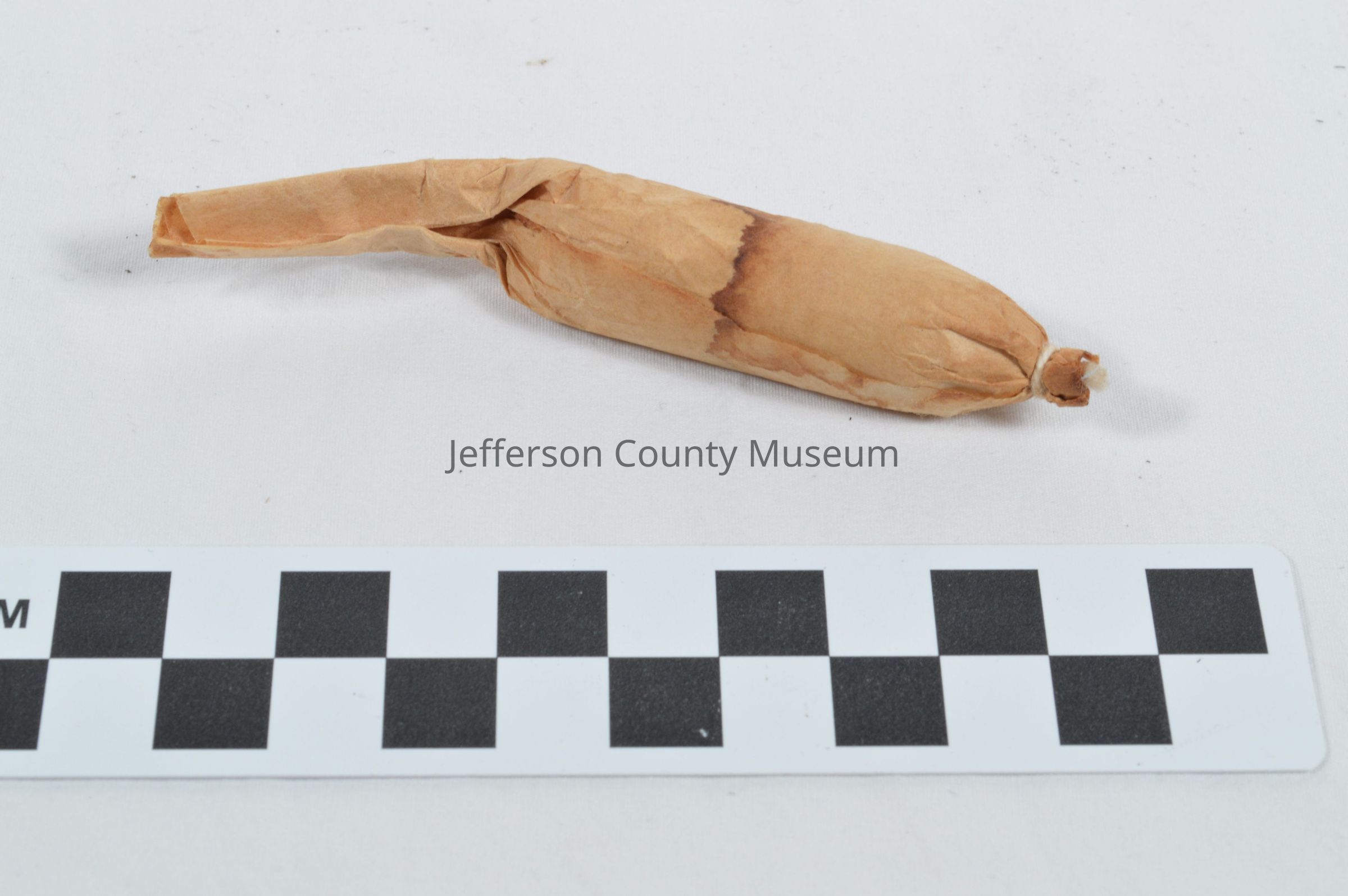 Reproduction .58 caliber bullet wrapped in paper and tied at end with string.
