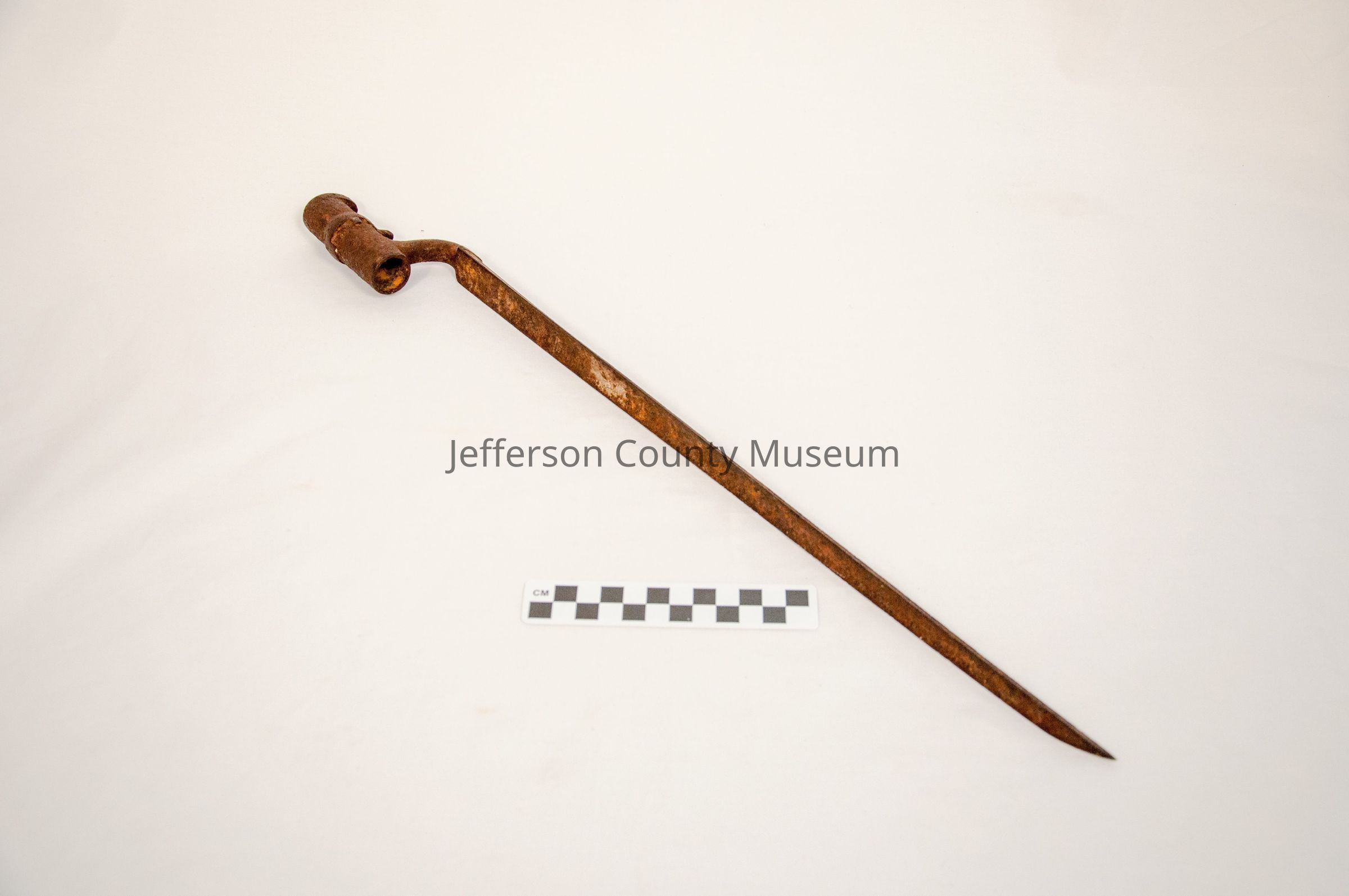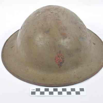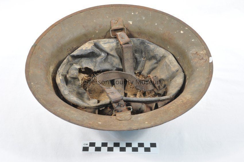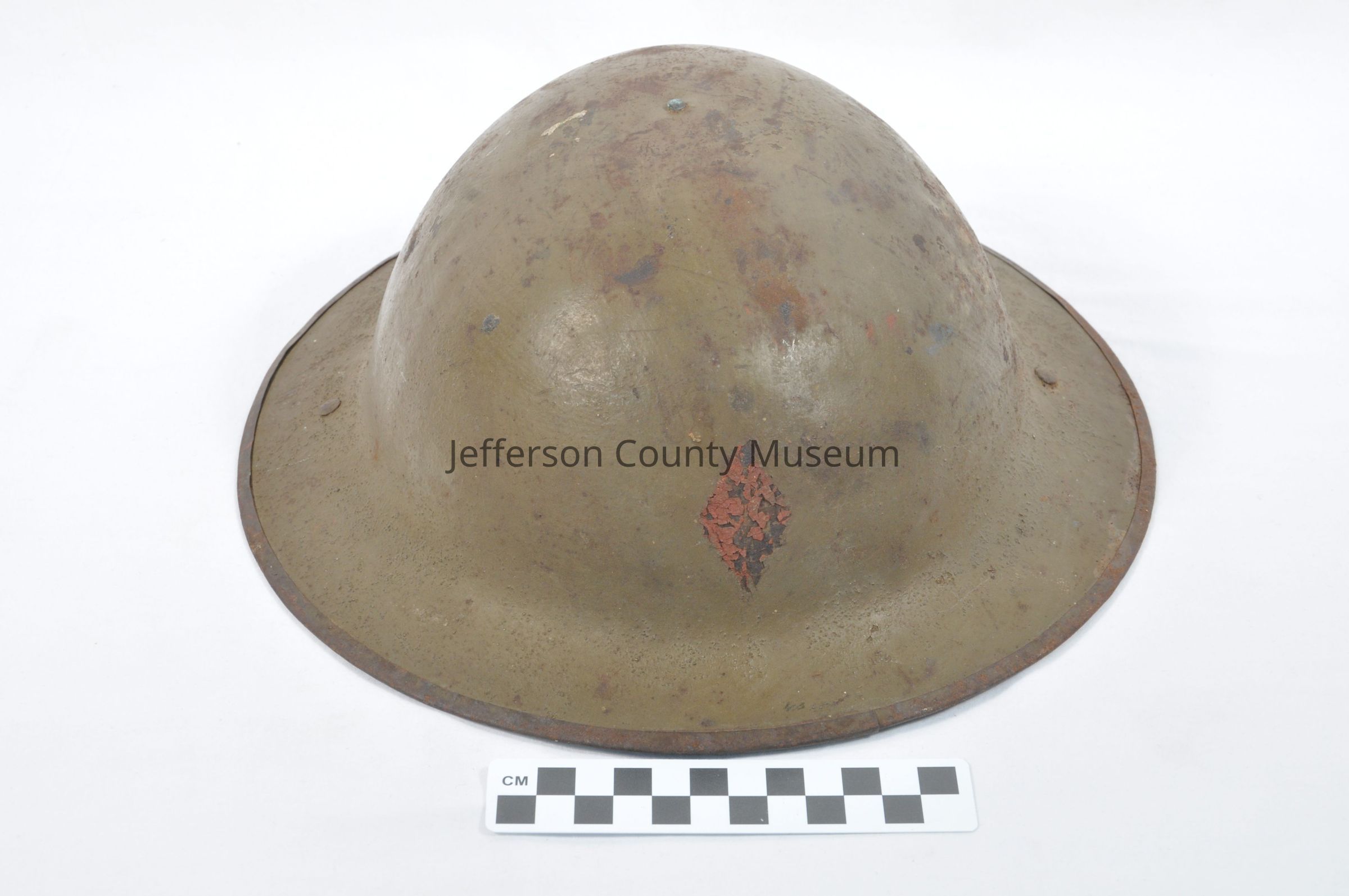 World War I U.S. Infantry steel helmet. Leather strap and webbing. Remnants of red diamond shaped logo on front.Acquisition
