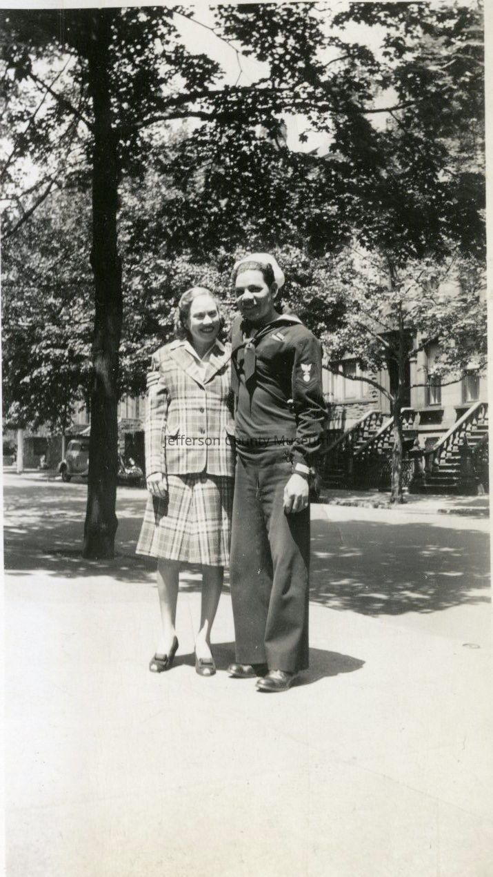 13. Black & white photo of unidentified man and woman, man is wearing U. S. Navy uniform, Lockwood House (Storer College) in background