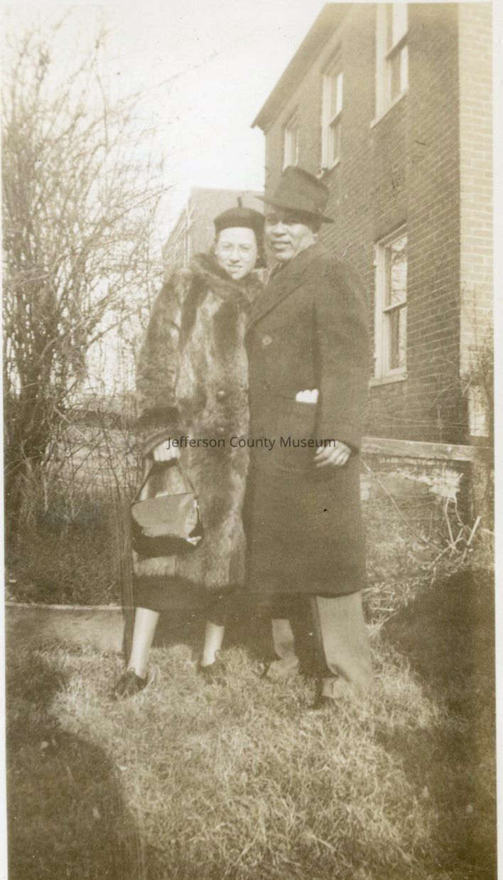 15. Black & white photo of unidentified man and woman, man is wearing a fedora, woman is wearing fur coat, possibly Storer College
