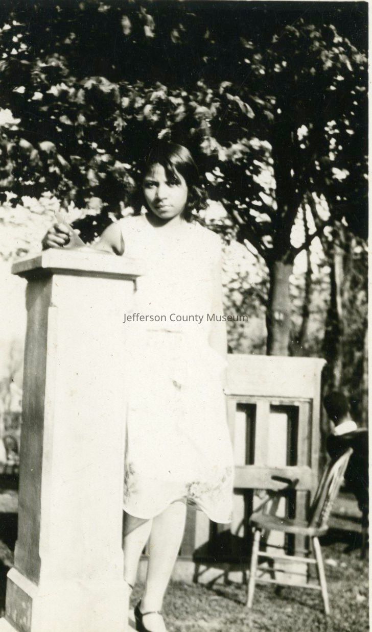 16. Black & white photo of young unidentified woman standing by a pedestal, possibly Storer College