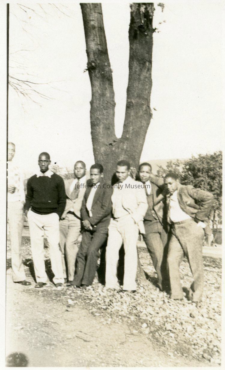 17. Black & white photo of seven unidentified young men standing in front of tree, possibly Storer College