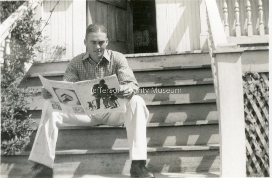 23. Black & white photo of unidentified man sitting on porch steps and reading a magazine, possibly Storer College