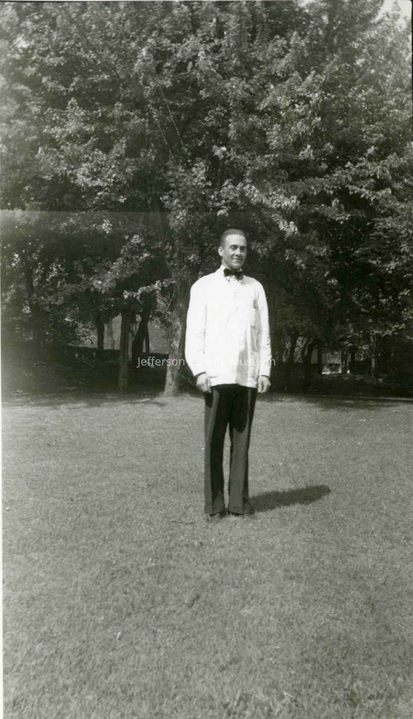 24. Black & white photo of unidentified man wearing white jacket, black slacks, and black bowtie, possibly Storer College