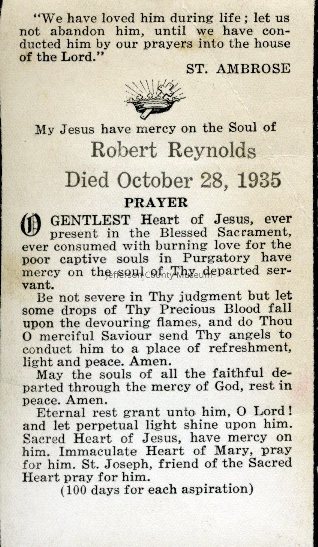 26. Black & white prayer card for Robert Reynolds, died Oct 28, 1935Acquisition