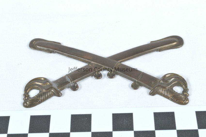 Stamped brass U.S. 1860 cavalry hat badge. Crossed swords. Solder on back in four places where wires were attached for fastening to hat.Acquisition