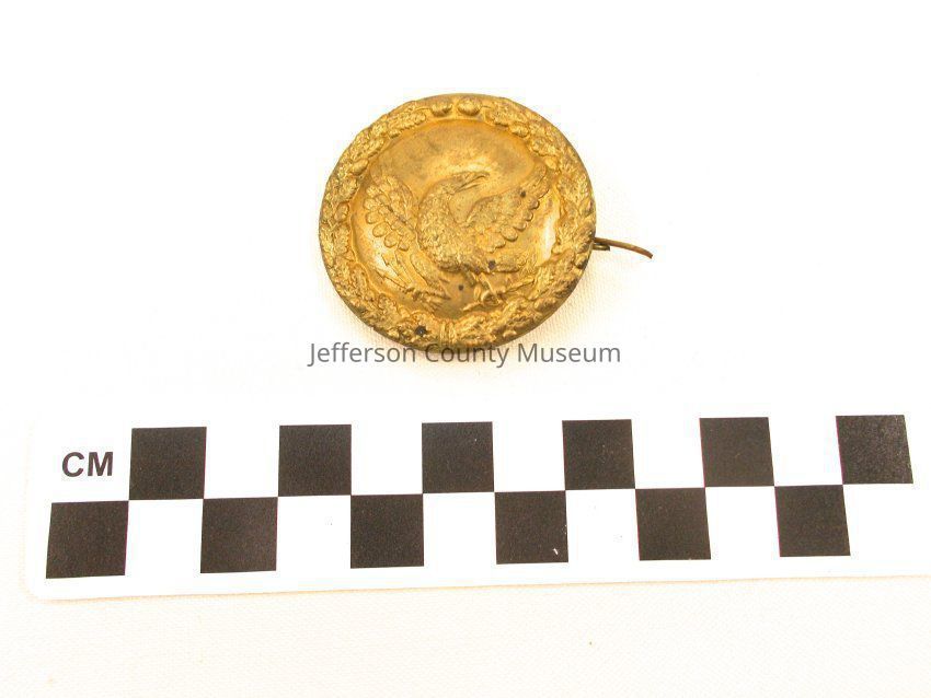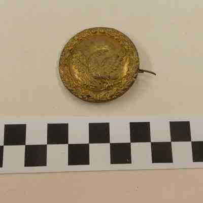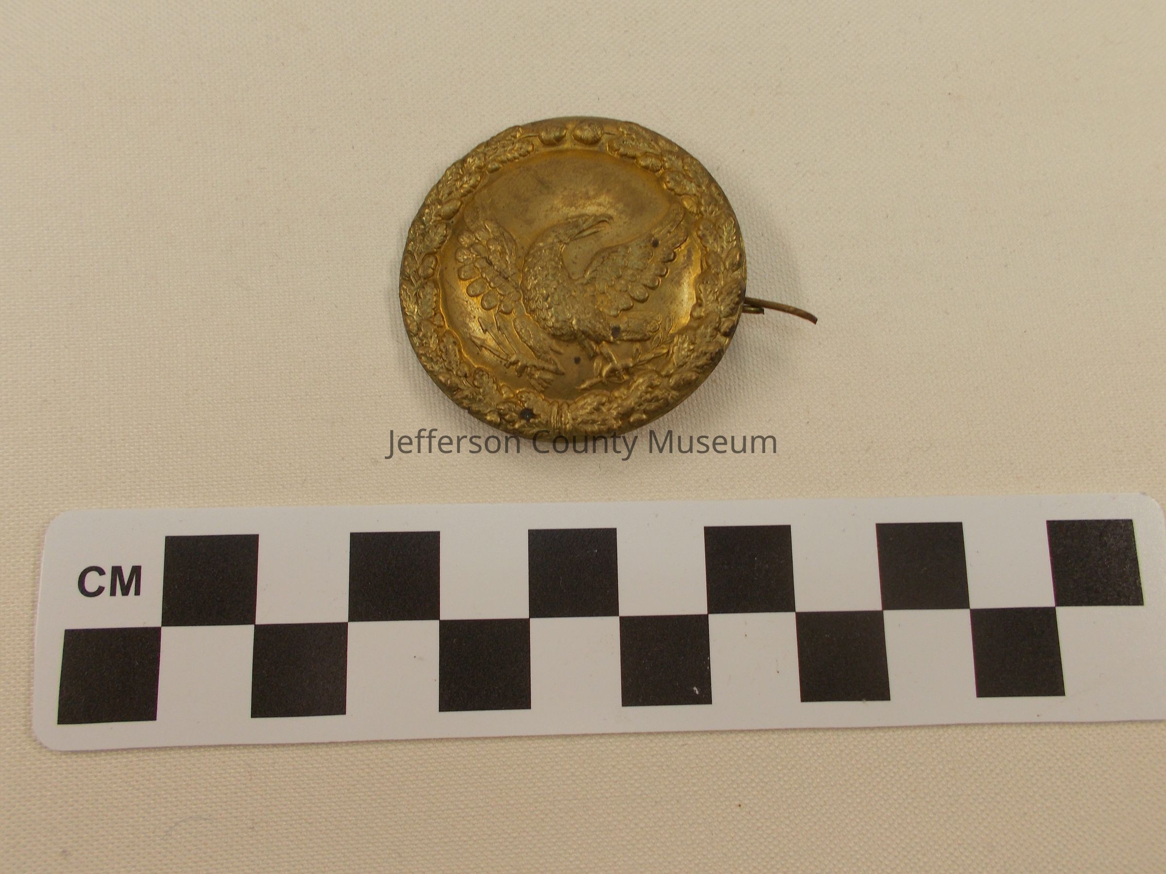 Mexican-War era round stamped brass hat badge with spread-winged eagle holding arrows in left claw and olive branch in right. Wreath of oak leaves and acorns surrounds eagle. Two wires soldered on back for attaching to hat.Acquisition