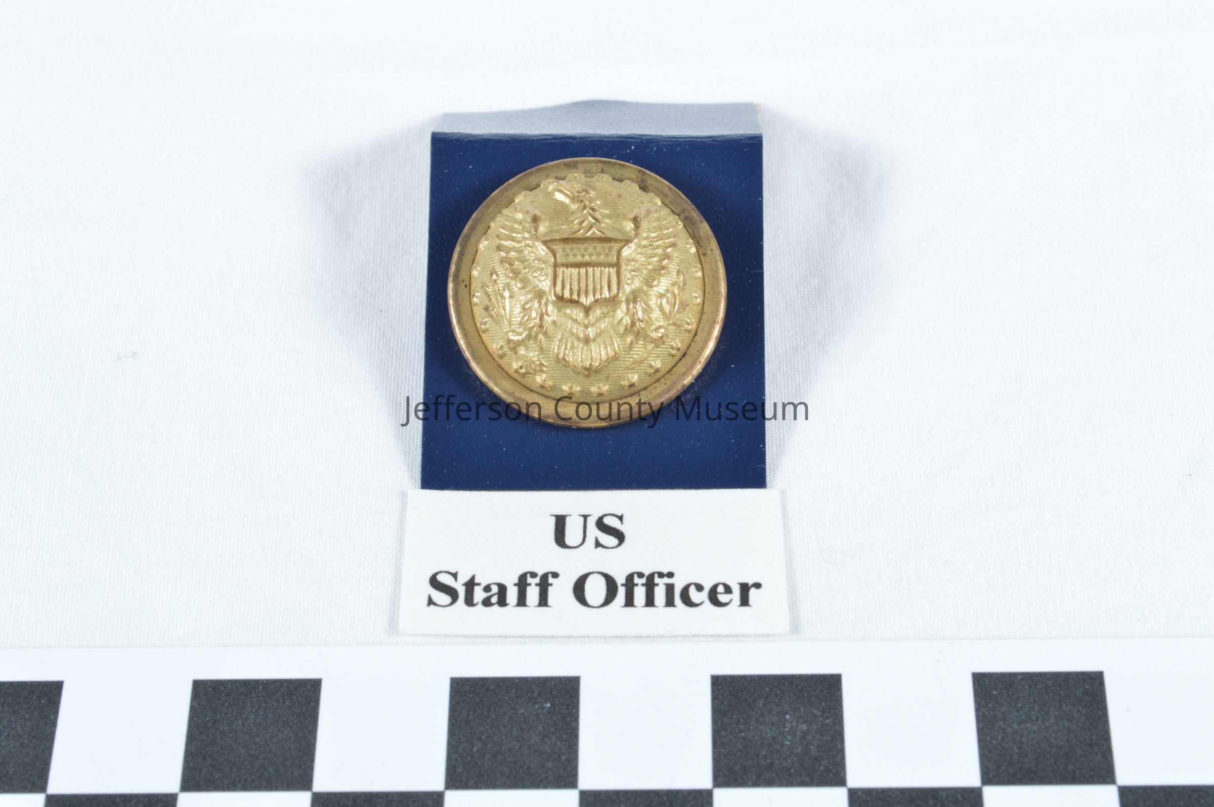 Stamped brass U.S. staff officer's uniform button. Spread-winged eagle with shield on front. Eagle has four arrows in left claw and olive branch in right. Stars surround the eagle. On back "SCOVILL MFG Co WATERBURY".Acquisition