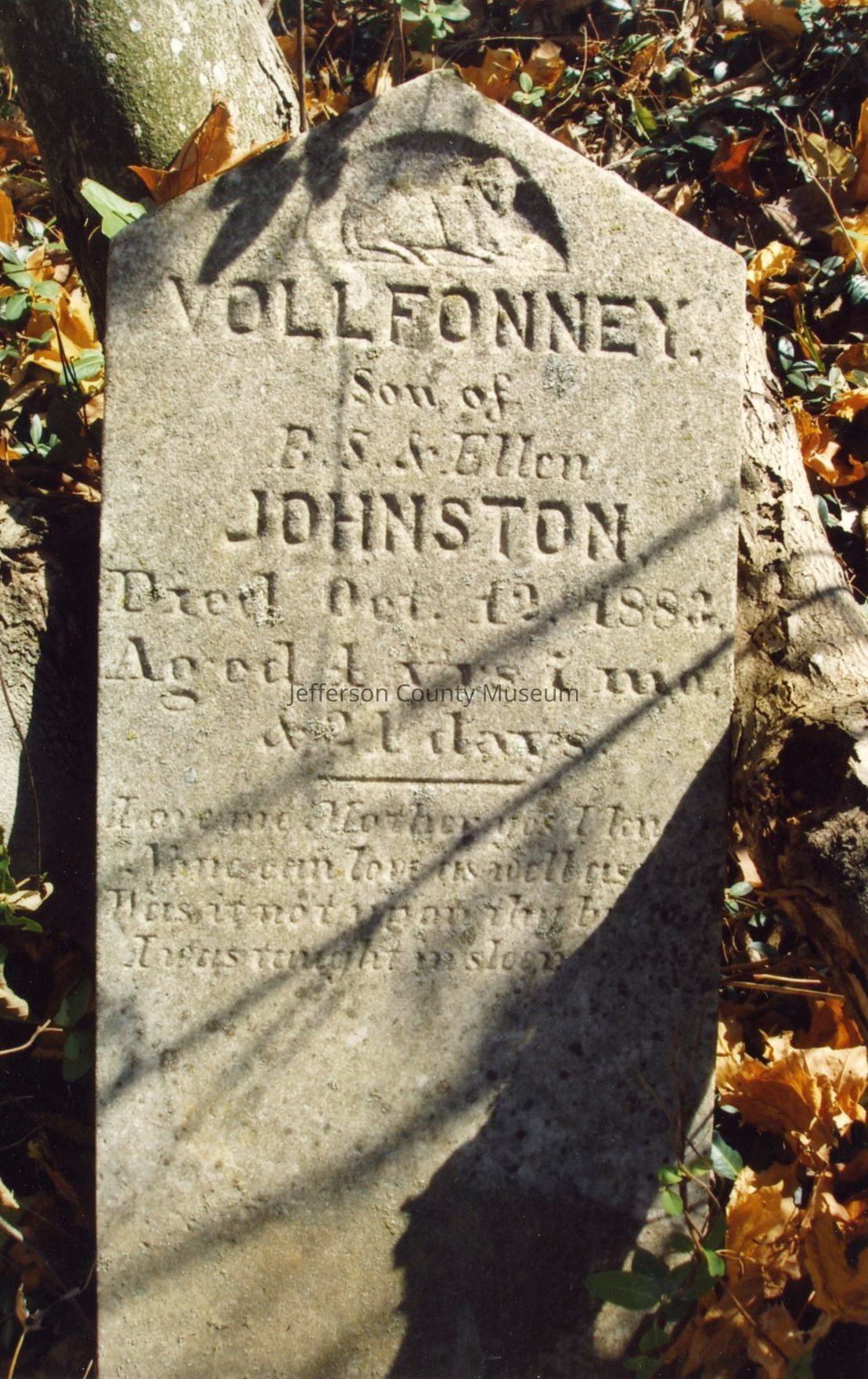 Kabletown Churchyard gravestone for Vollfonney, son of B. S. and Ellen Johnston, Died Oct. 12, 1882, aged 4 years, 7 months, and 21 daysAcquisition