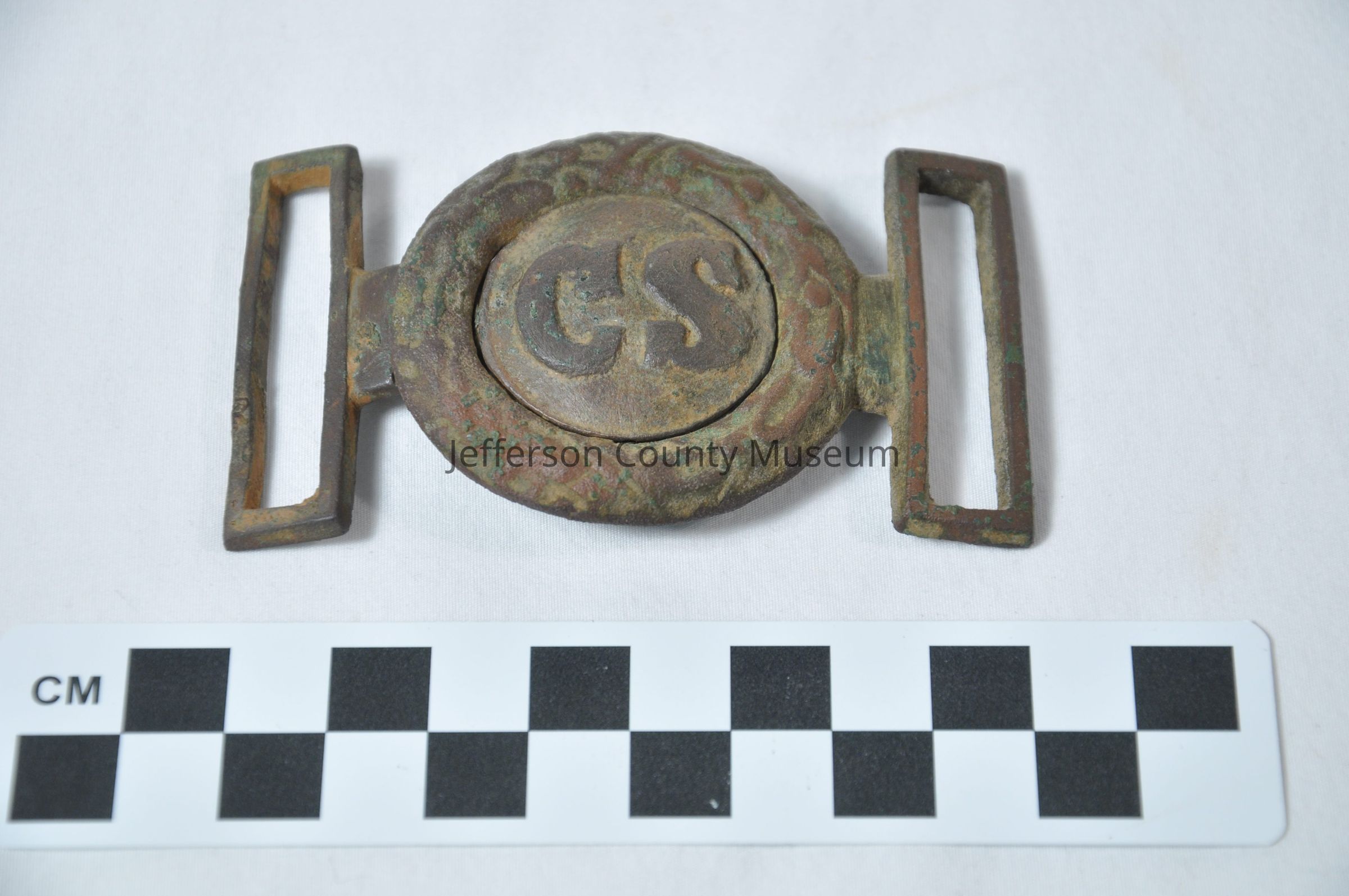 Two piece waist belt plate. On one piece is "CS". The piece the "CS" connects to has wreath around whole. Excavated.Acquisition