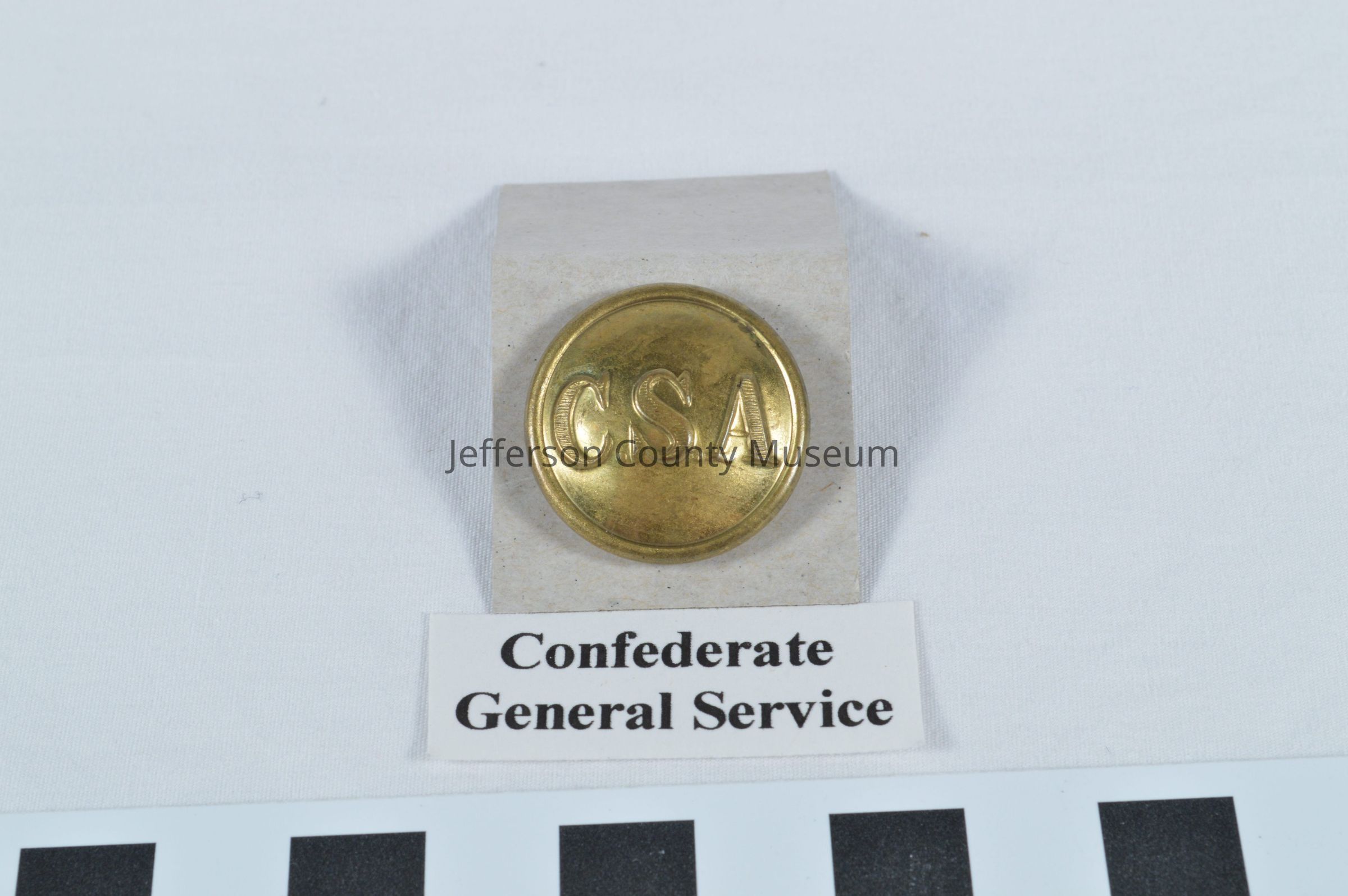 Brass Confederate general service button. Stamped on front "CSA". Stamped on back "SUPERIOR QUALITY".Acquisition