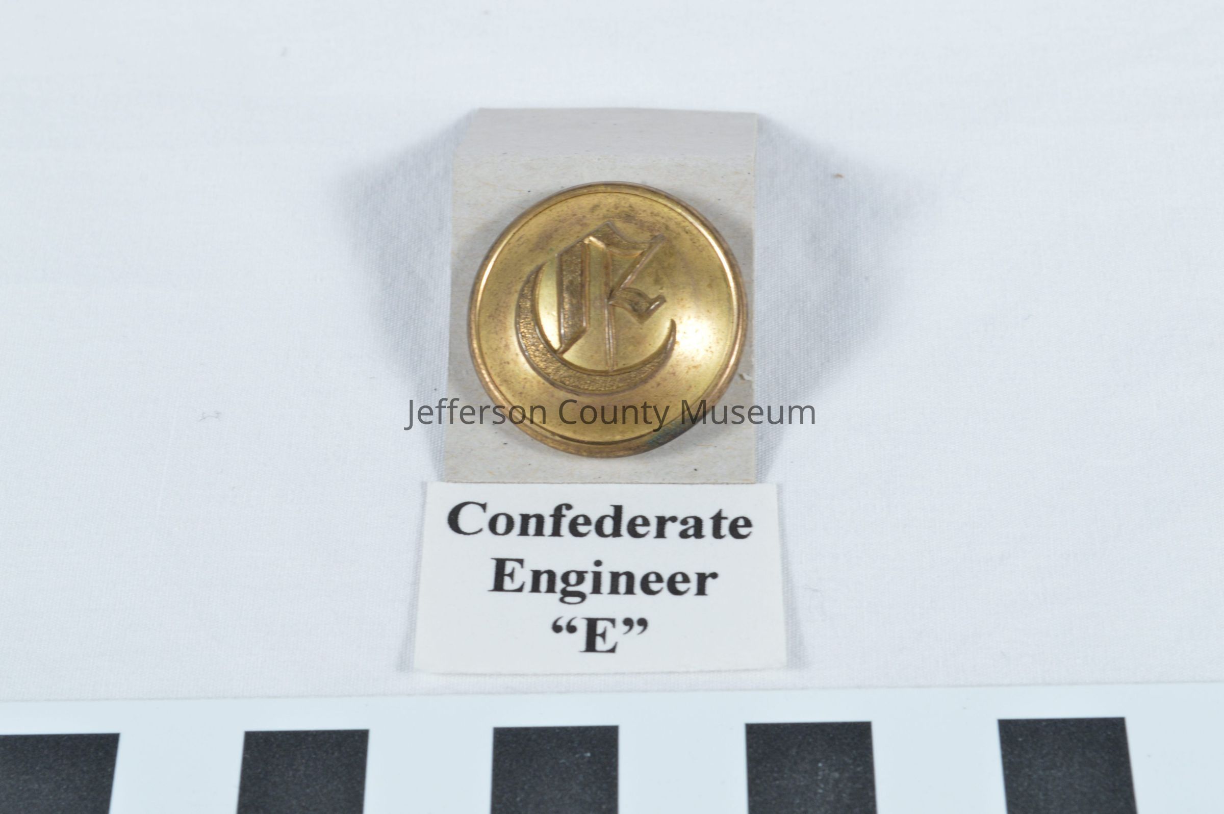 Brass Confederate engineer uniform button. Large calligraphic "E" on front. On back "H T & B MANCHESTER".Acquisition