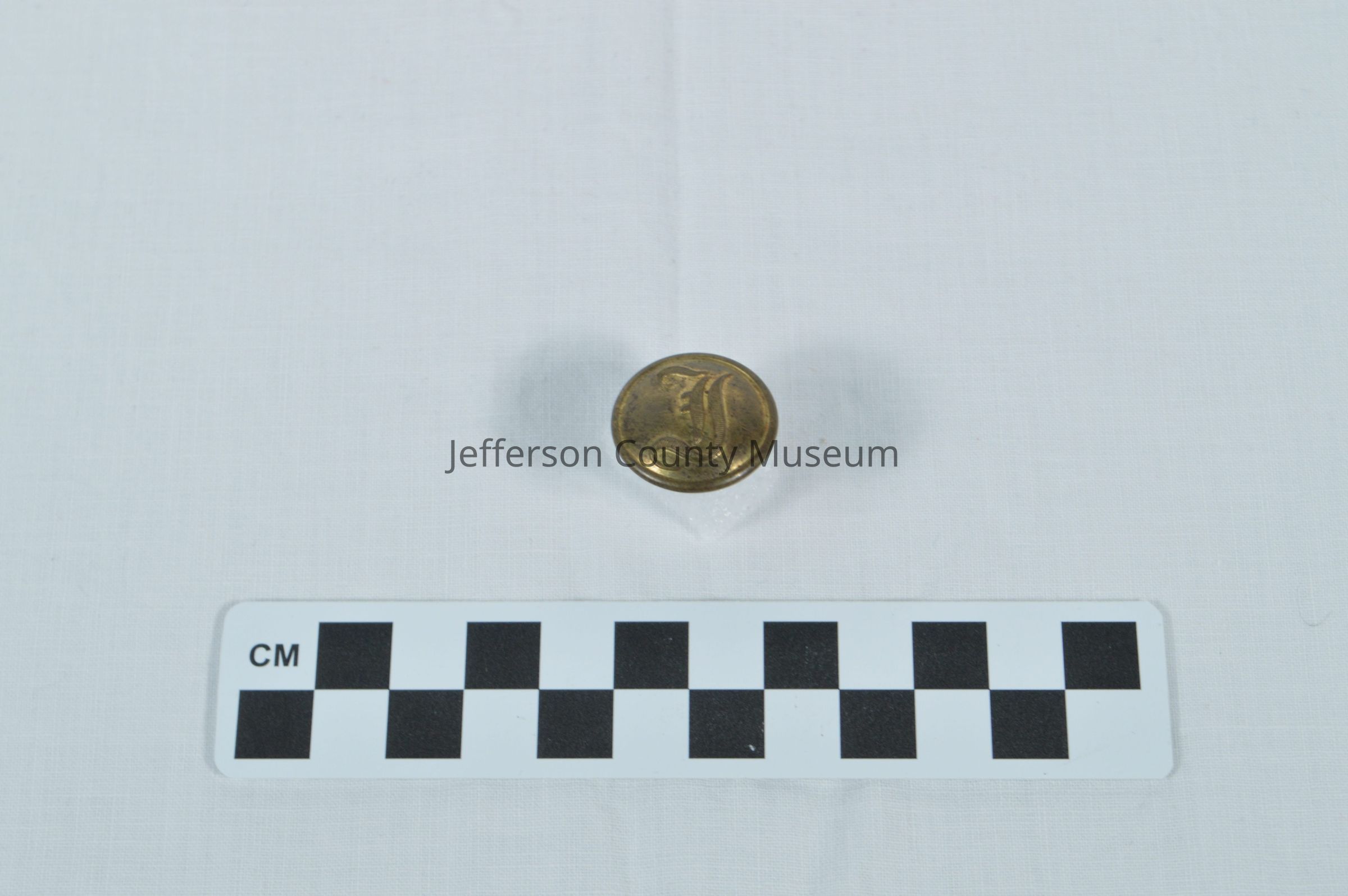 Brass Confederate infantry uniform button. Large calligraphic "I" on front. On back "ISAACS CAMPBELL & CO. LONDON 71 JERMYN ST."Acquisition