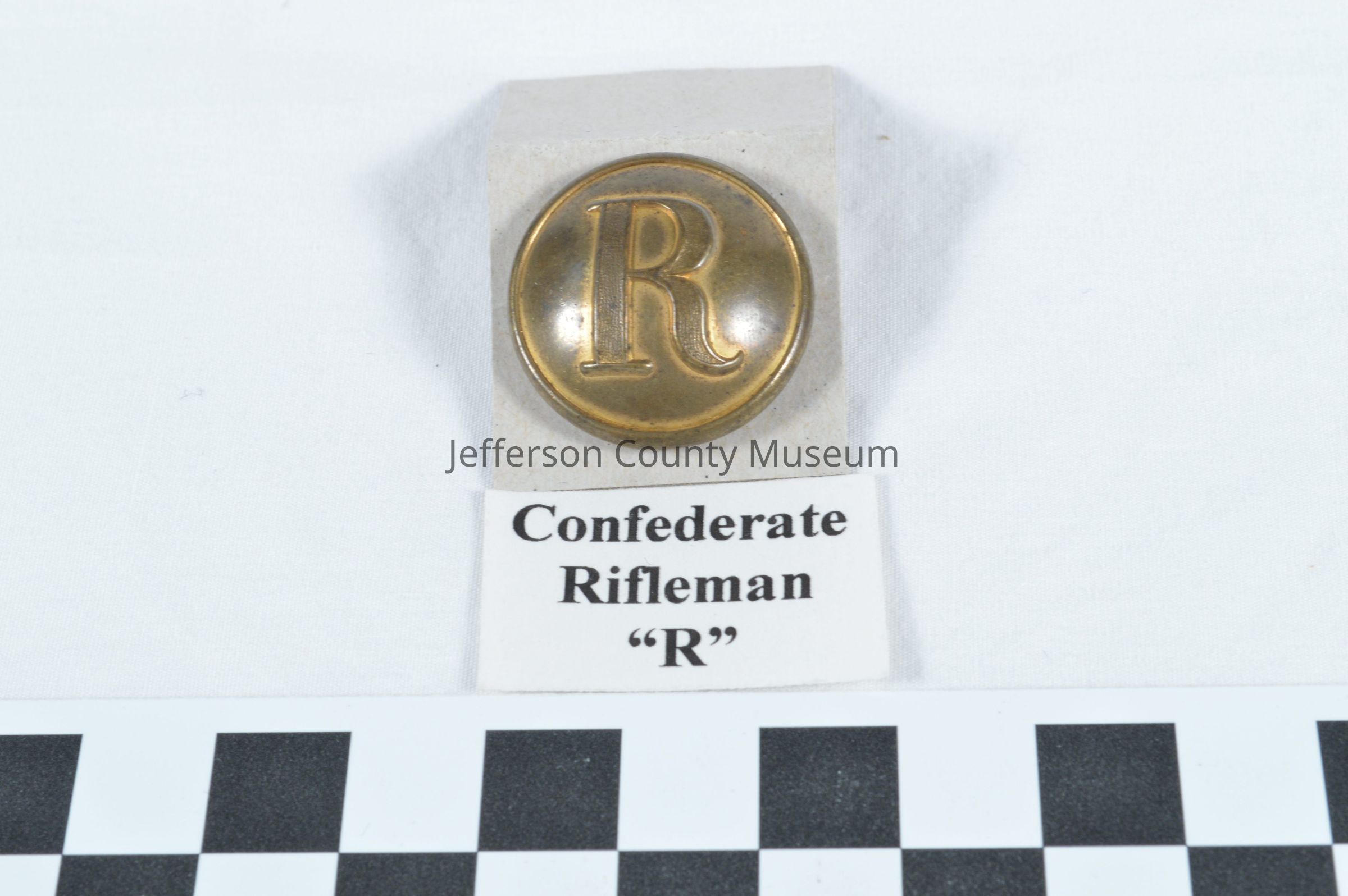 Brass Confederate rifleman uniform button. Large plain "R" on front. On back "H T & B MANCHESTER".Acquisition
