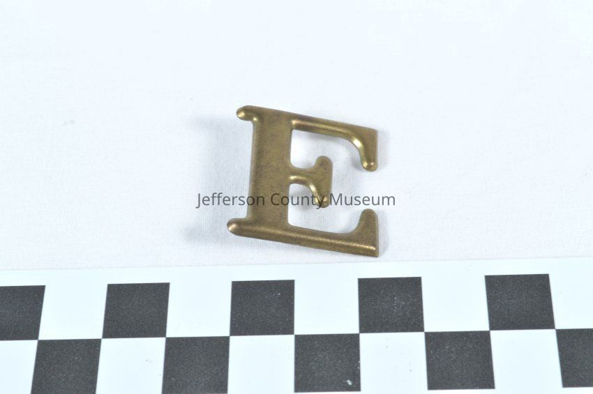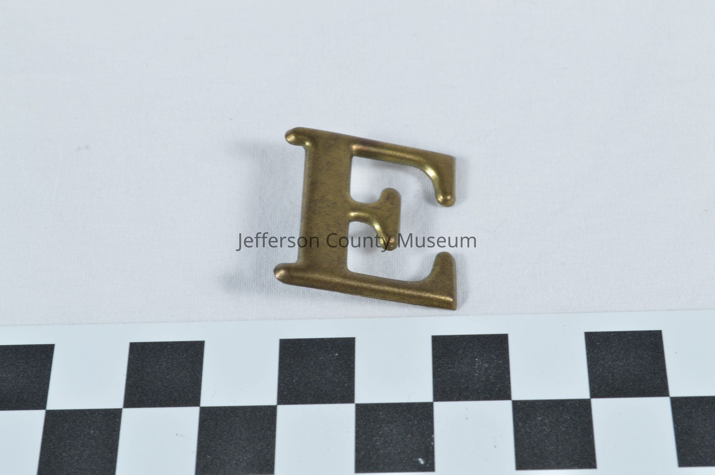 Stamped brass Company "E" hat badge. Small U shaped hook soldered to back for attaching to hat.Acquisition