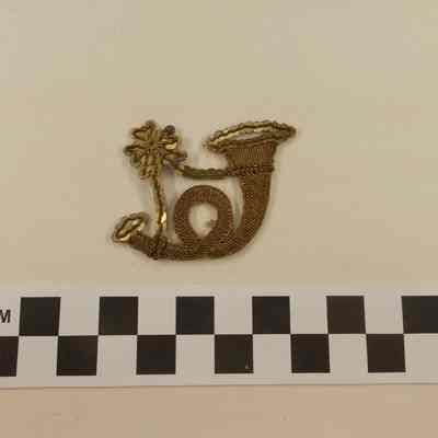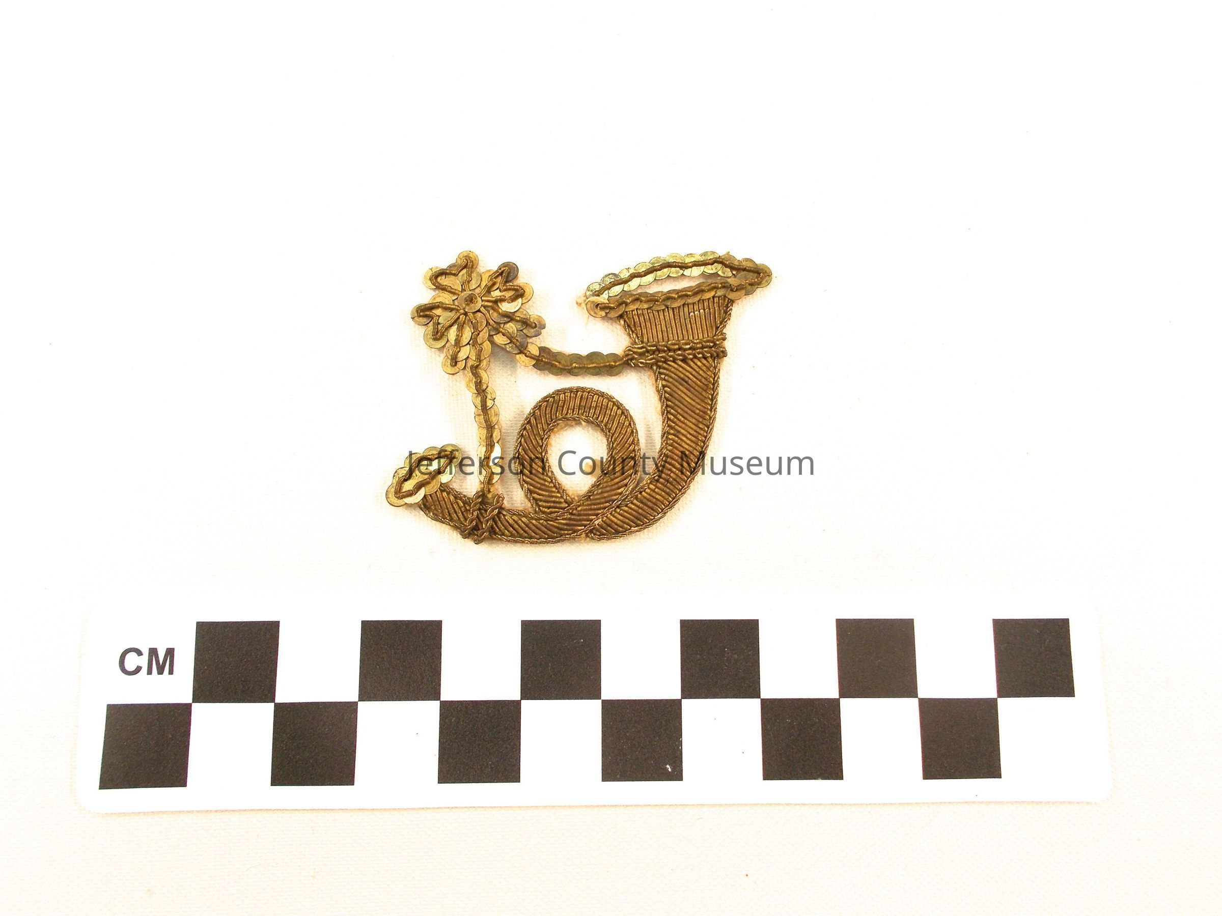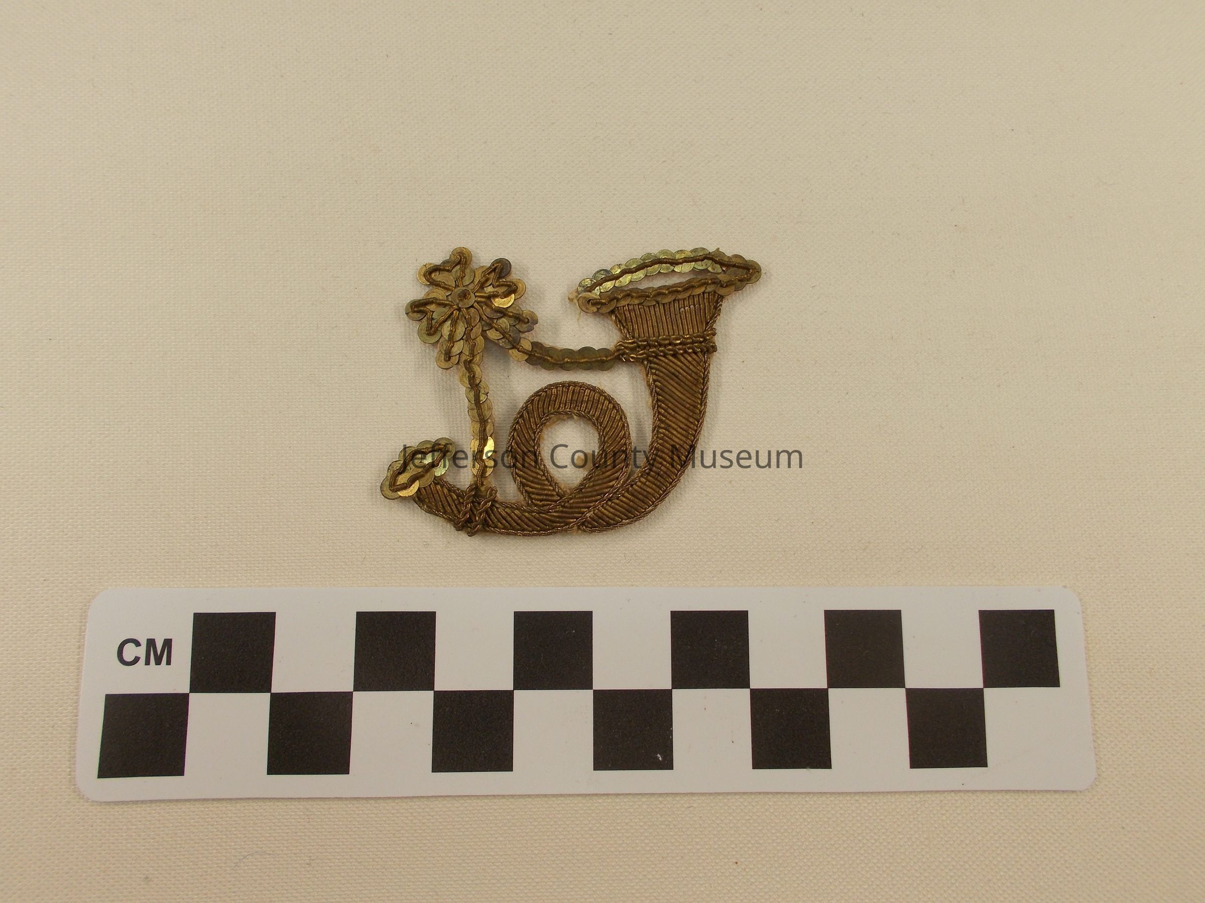 Infantry insignia. Hunting horn made of fabric, gold thread and sequins. A flower or star shaped adornment is hanging from the horn. No markings.Acquisition