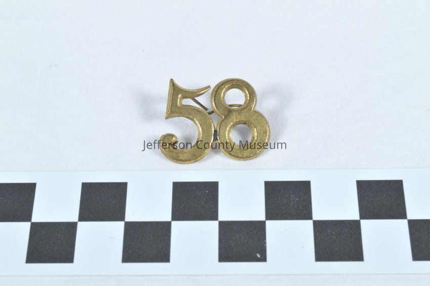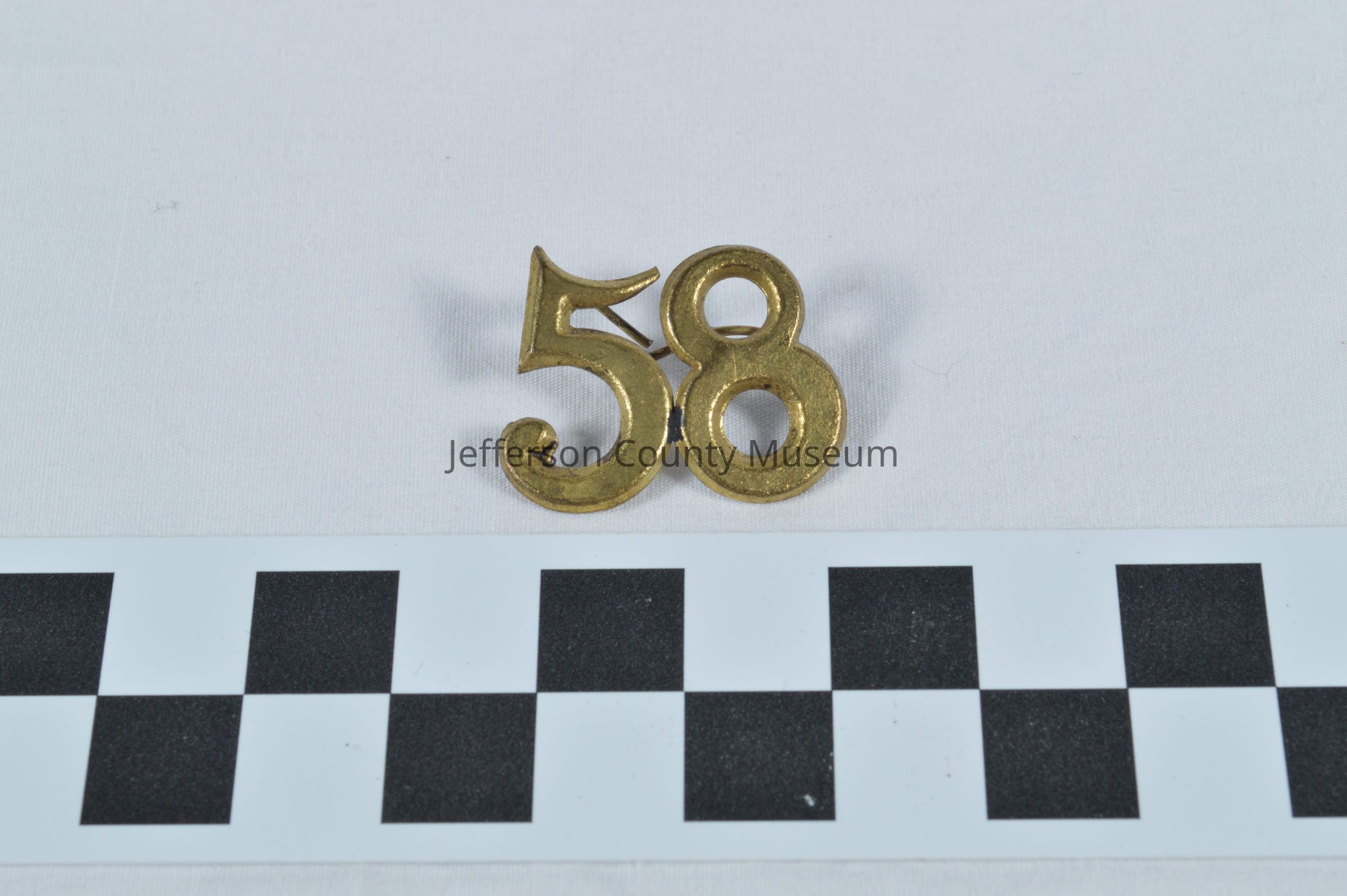 Regimental number stamped brass "58". Two wires soldered to back for attaching to hat.Acquisition