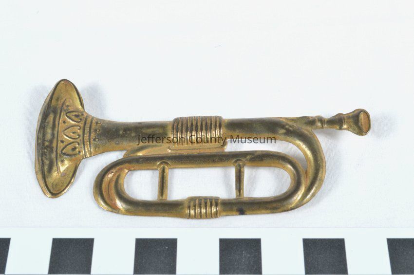 Stamped brass 1860 U.S. Mounted Rifles hat badge in shape of trumpet.