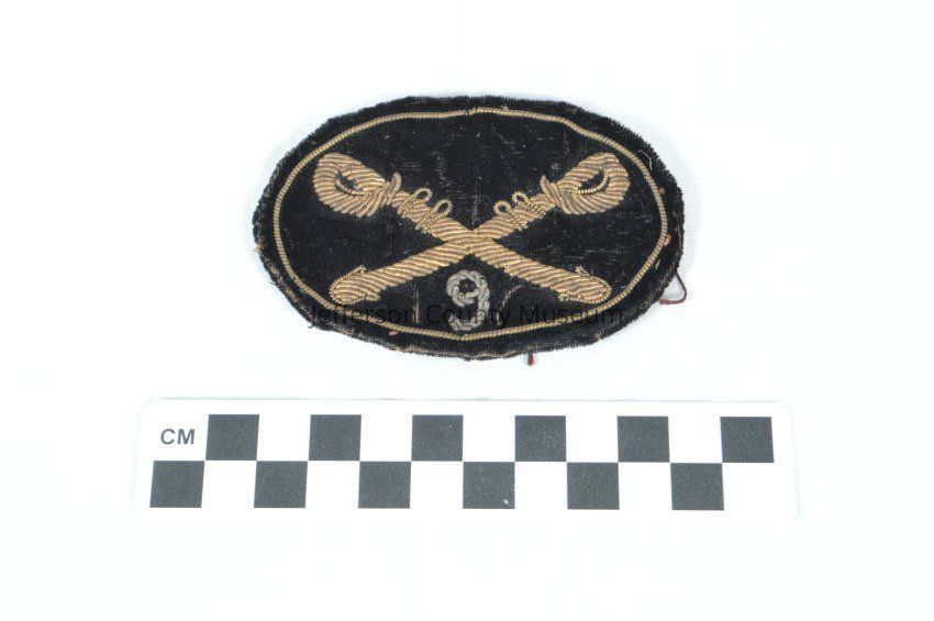 Black velvet and gold thread U.S. 1860 6th Cavalry hat patch. Oval shaped. Crossed swords with number "6" above. Gold thread around outside edge.Acquisition