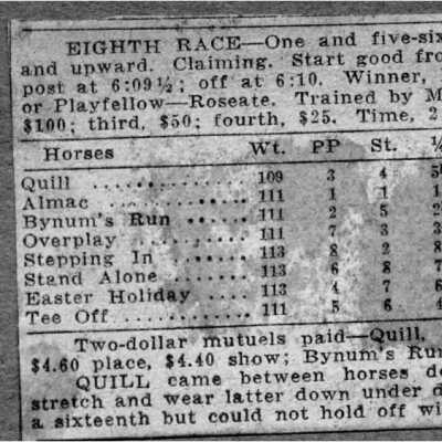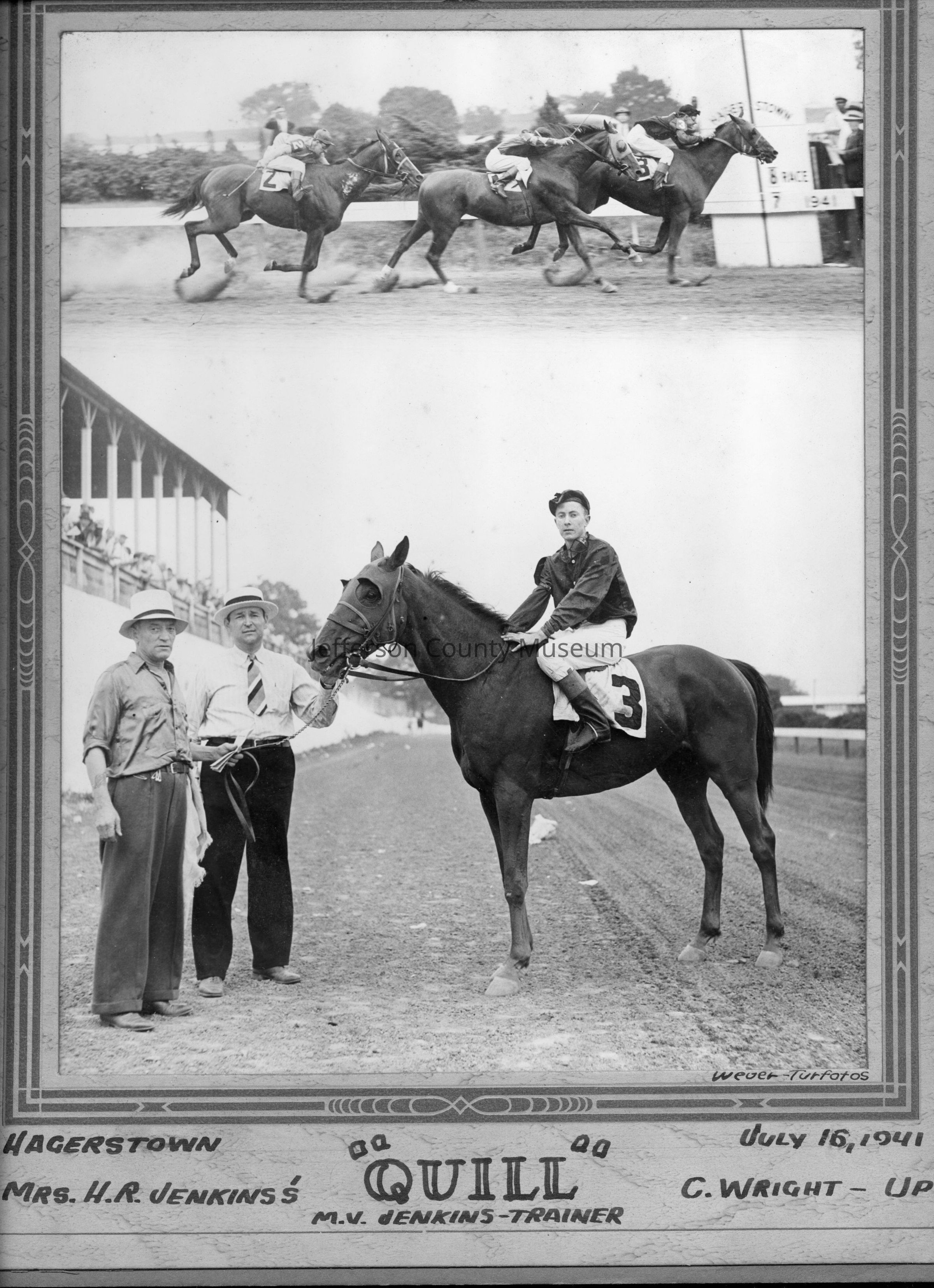 "Quill" at Hagerstown Racetrack, owner Mrs. H. R. Jenkins, trailer, M. V. Jenkins, jockey C. Wright