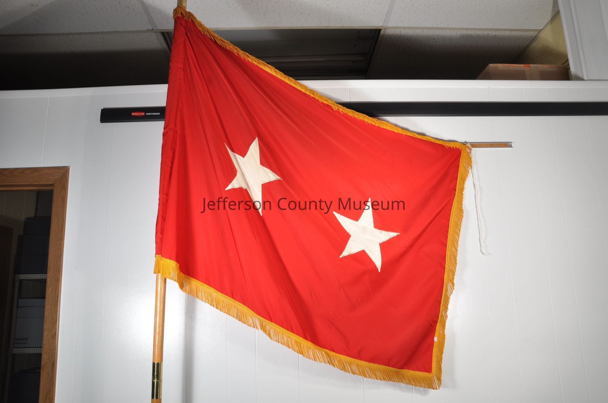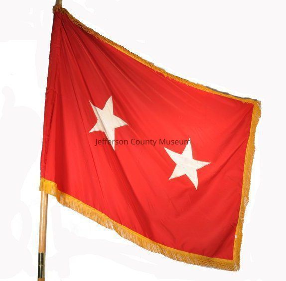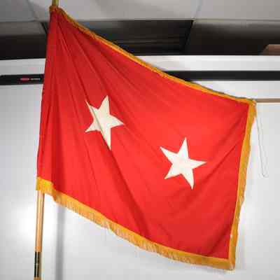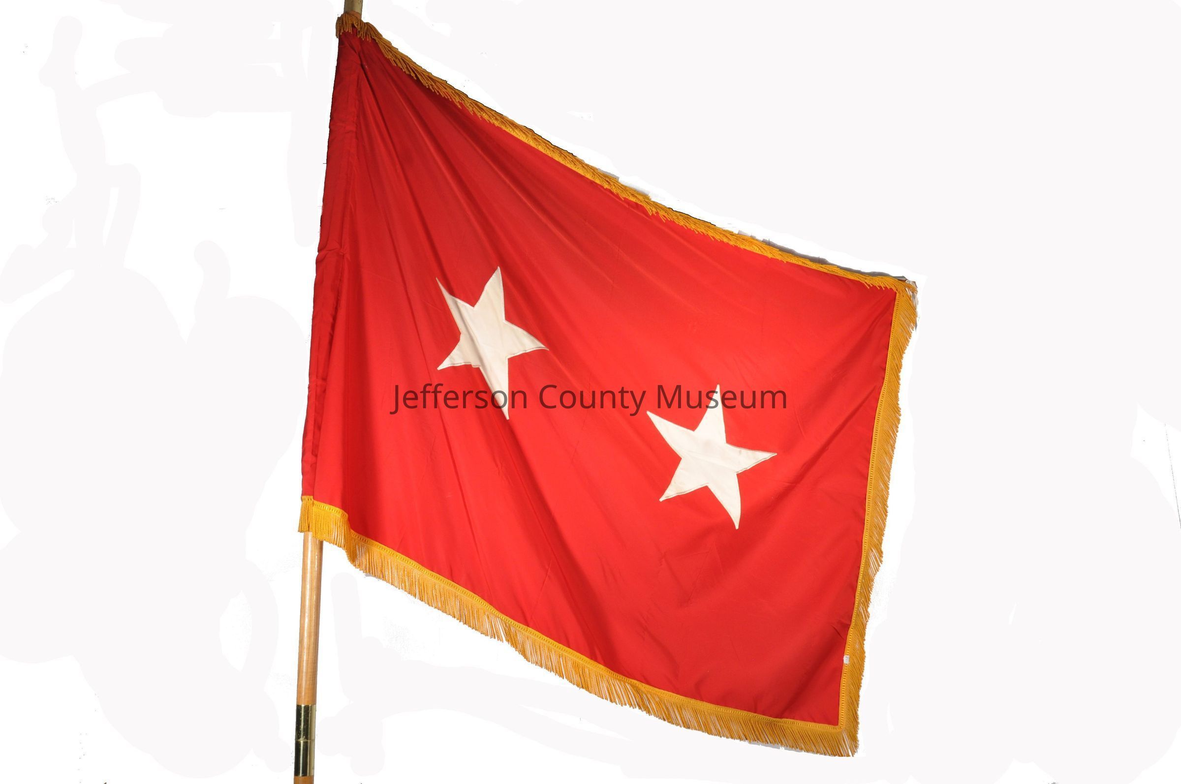 1118a: Red flag with two white major general's stars. Flag has gold fringe around edges.