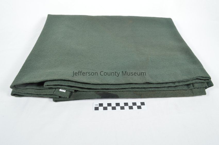 Green cotton tablecloth. A piece 37.3 cm. wide is sewn on to add width.