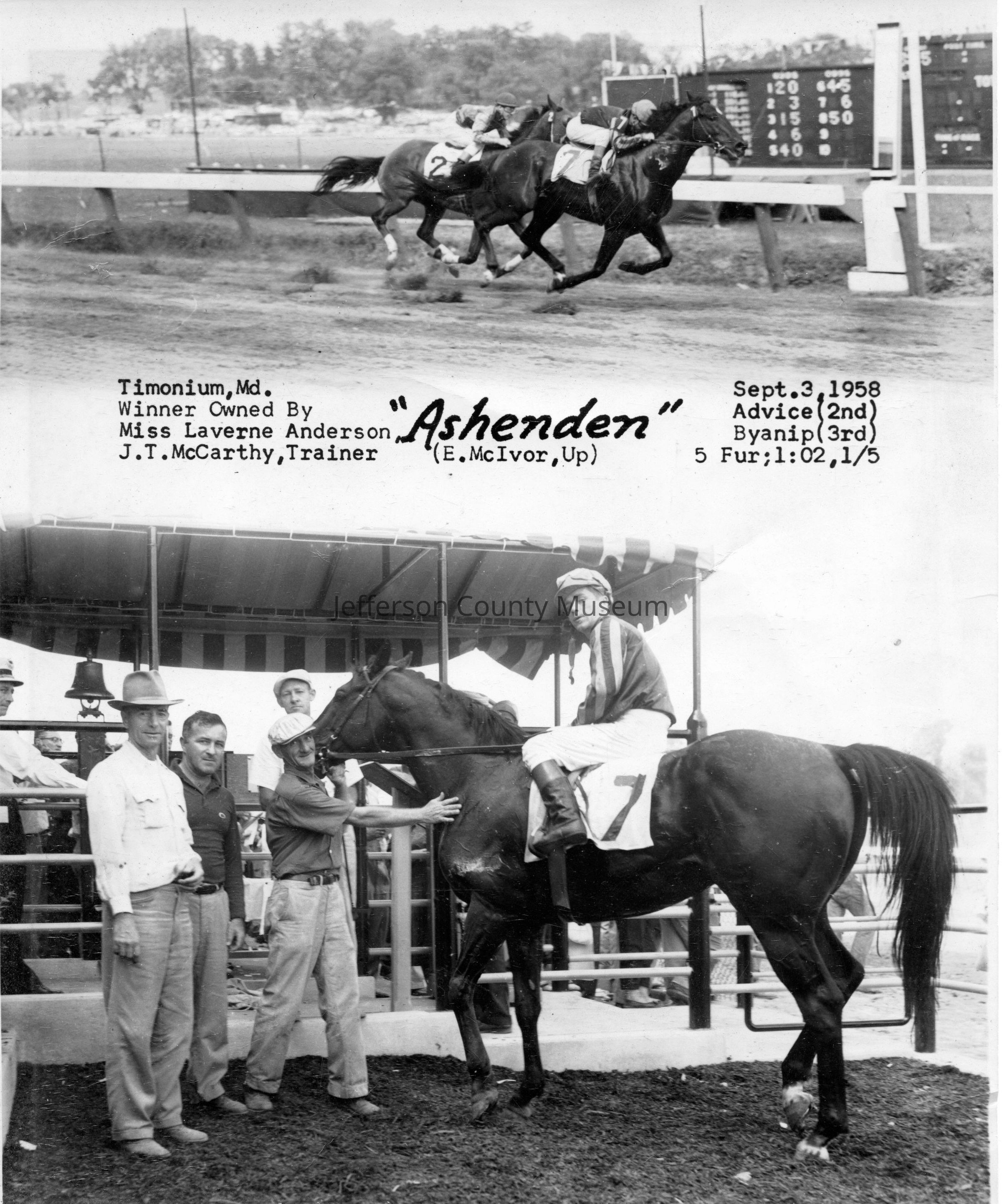 "Ashenden" at Timonium Race Track, owner Miss Laverne Anderson, trainer J. T. McCarthy, jockey E. McIvor