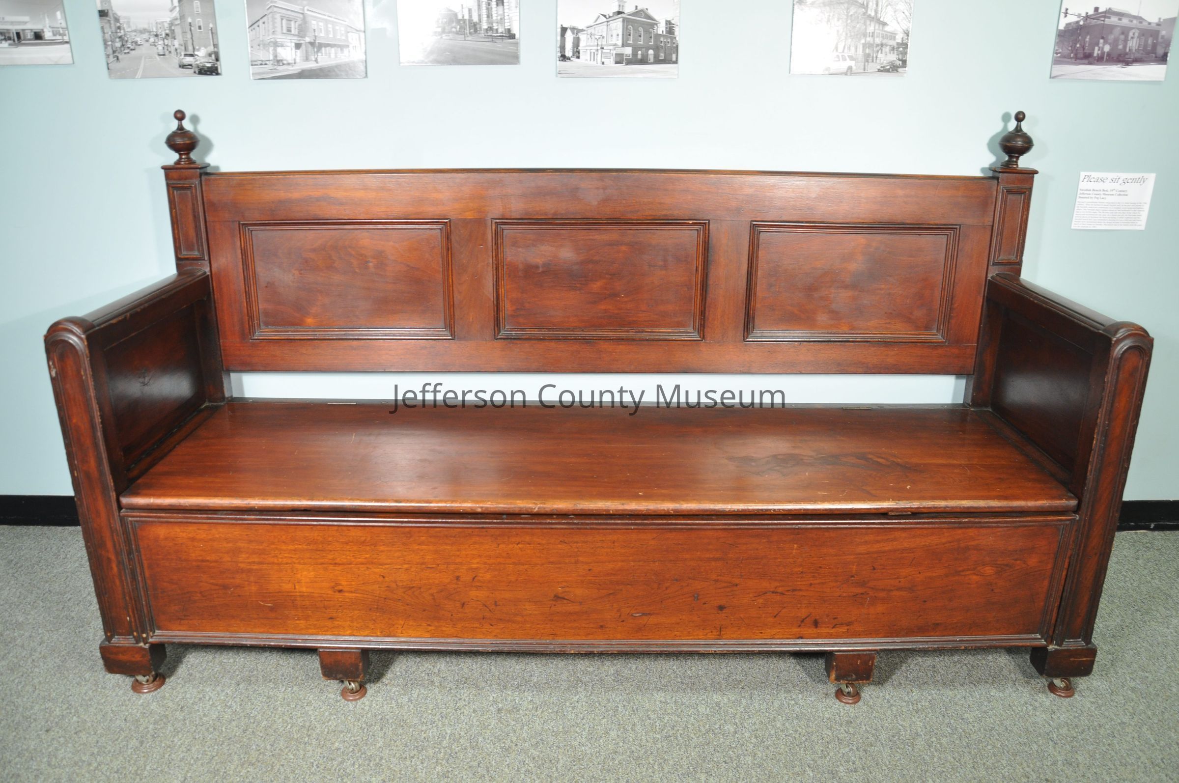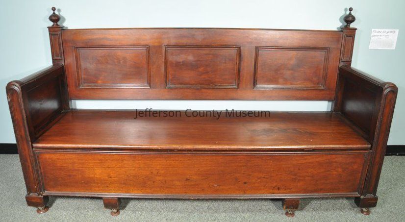 Handmade walnut bench with armrests and back, finished with two rounded finials. Wide seat opens and locks to reveal storage area. Storage compartment is on casters and can be rolled out to double its size for use as a bed. Style is known as Swedish bed or bench.Acquisition