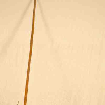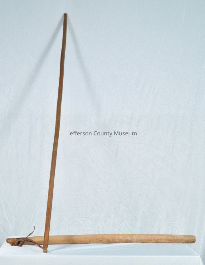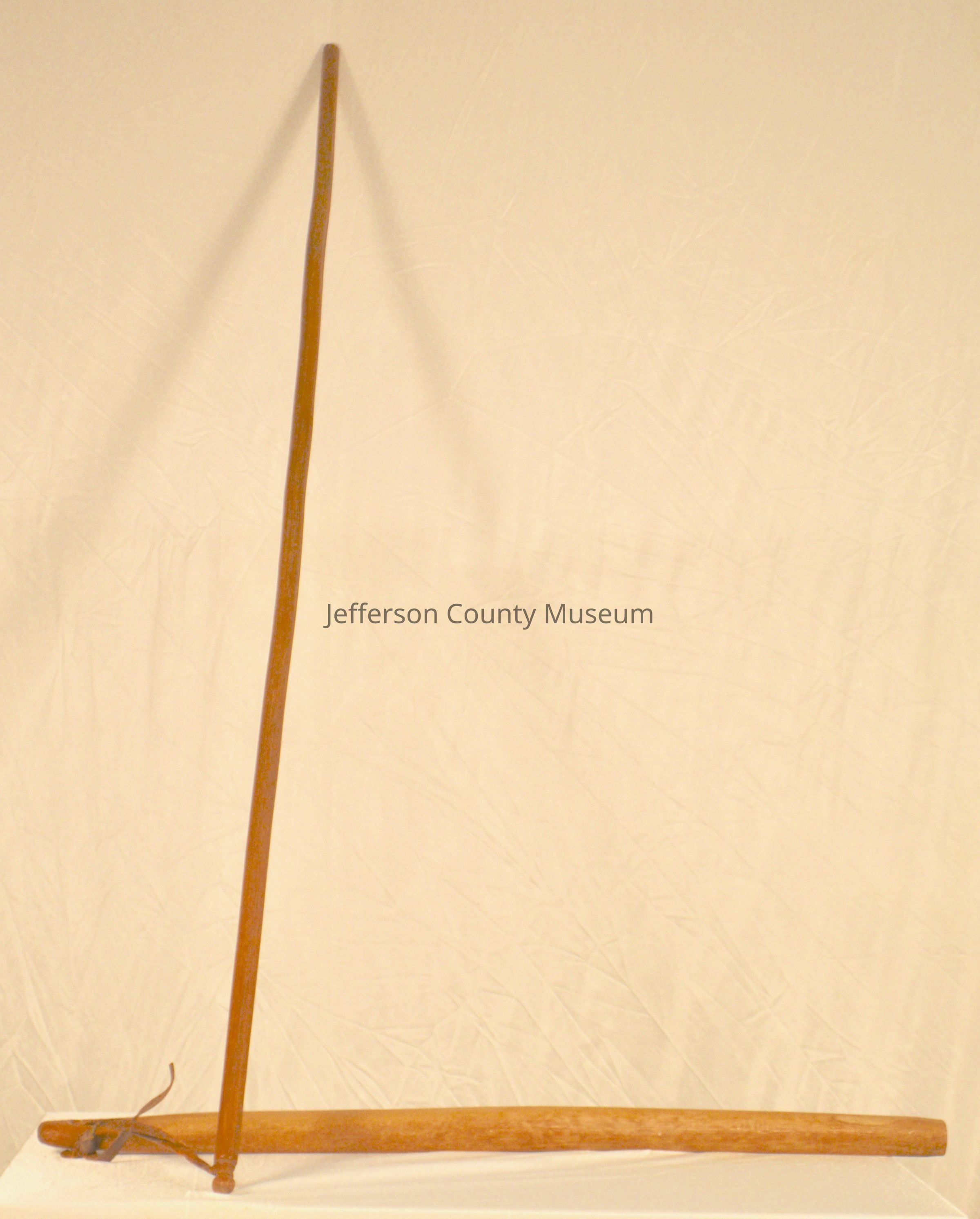 Wooden flail used to thresh grain. Long handle with leather strap attached to flail.