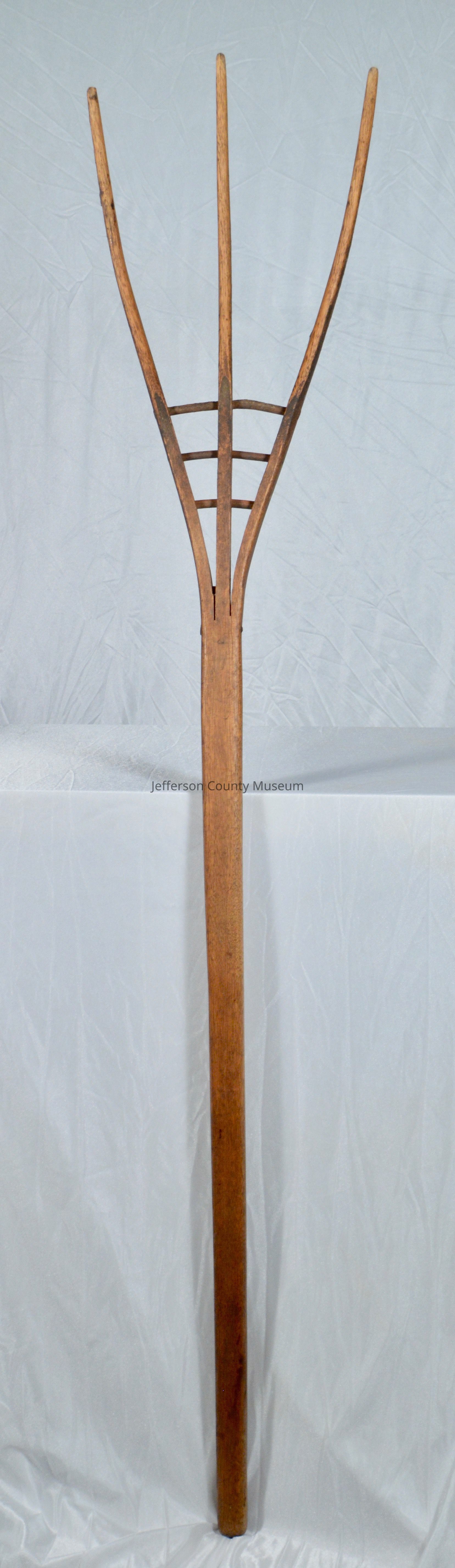 Wooden hayfork with three prongs. Prongs are flatter and less curved and handle is less curved than fork with catalog number 1148. Three wood dowels near base of prongs reinforce fork.Acquisition