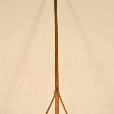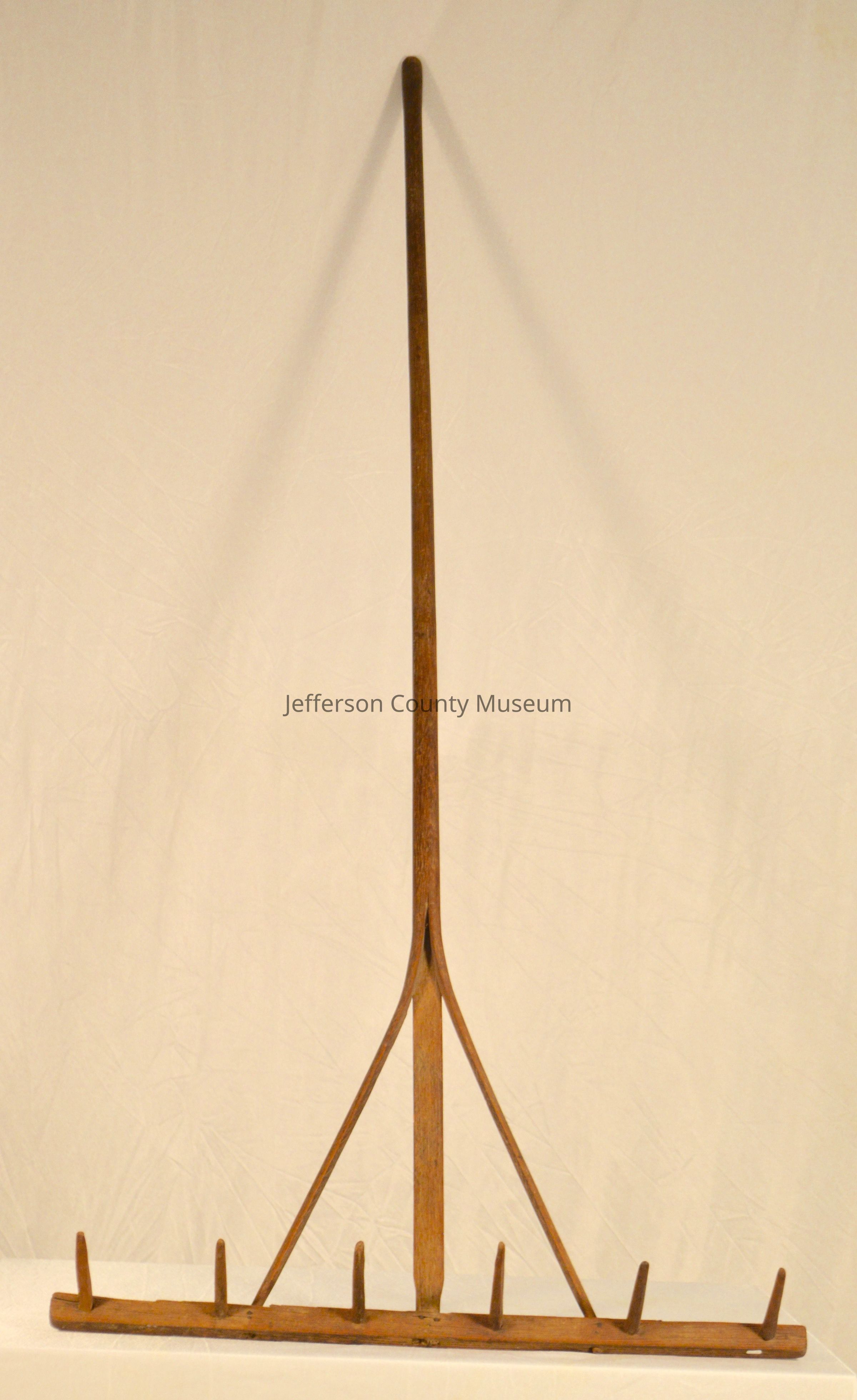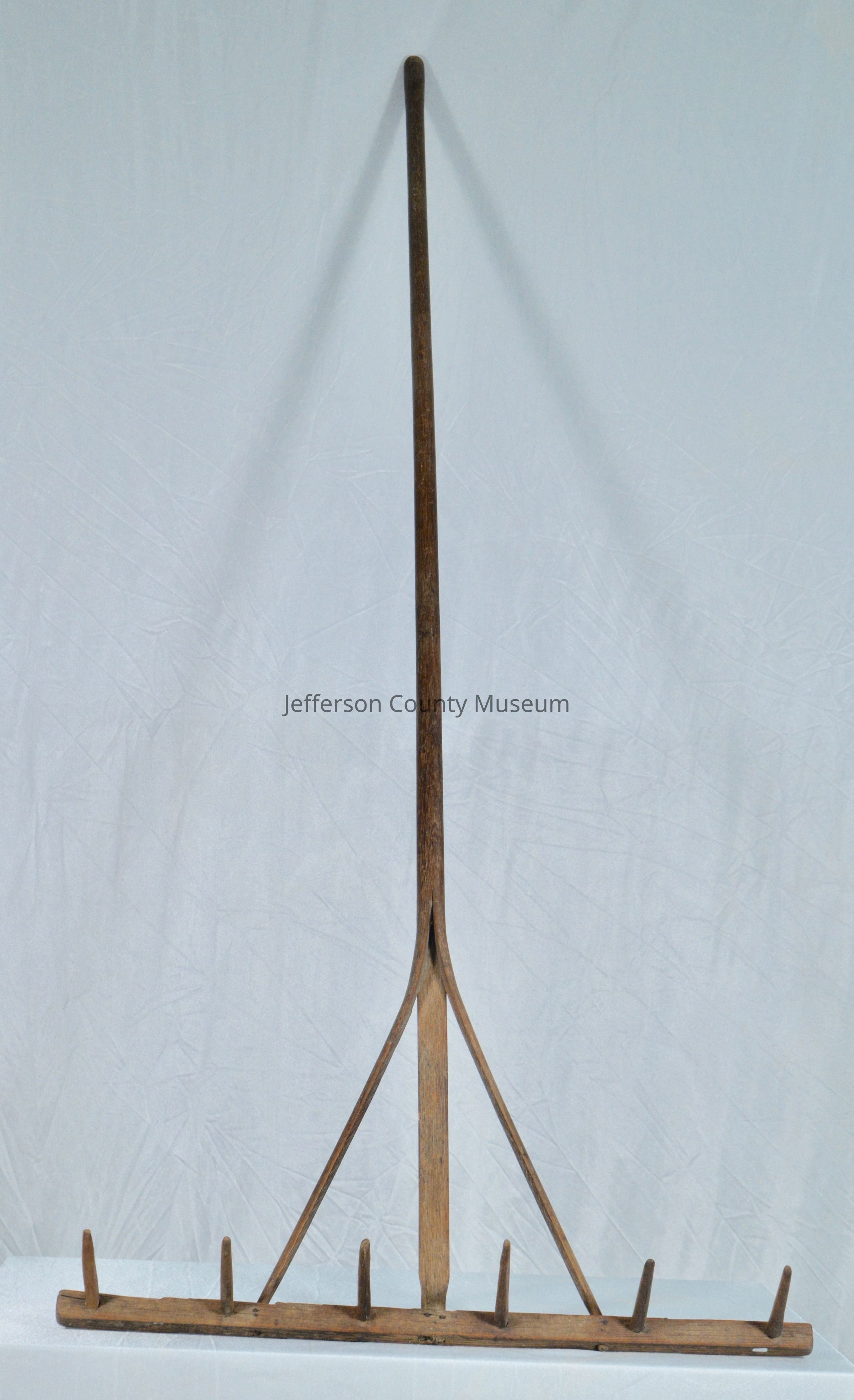 Wooden hay rake with six wood tines. Handle is split three ways in order to brace working end.Acquisition