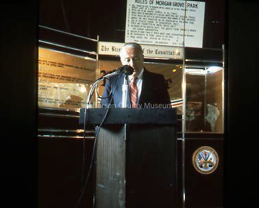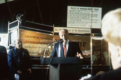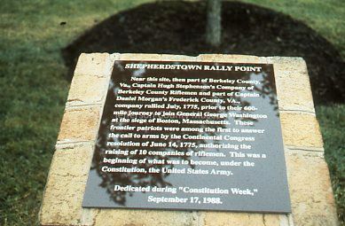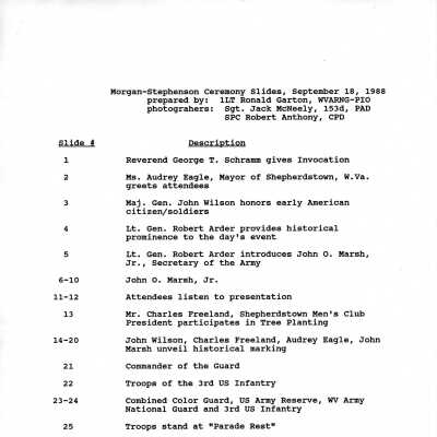 Stephenson-Morgan Ceremony, September 18, 1988, at Morgan's Grove Park in Shepherdstown, West Virginia. The ceremony honored Captain Daniel Morgan from Winchester and Captain Hugh Stephenson who lived in then Berkeley now Jefferson County. They were key figures in the formation of the First Army of the Continental Congress in June 1775. (from The Jefferson Advocate, September 22, 1988). [Final 3 slides are missing]