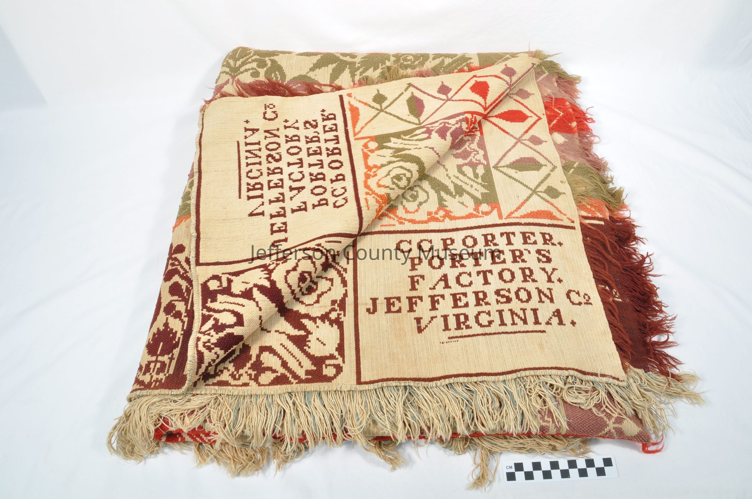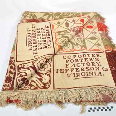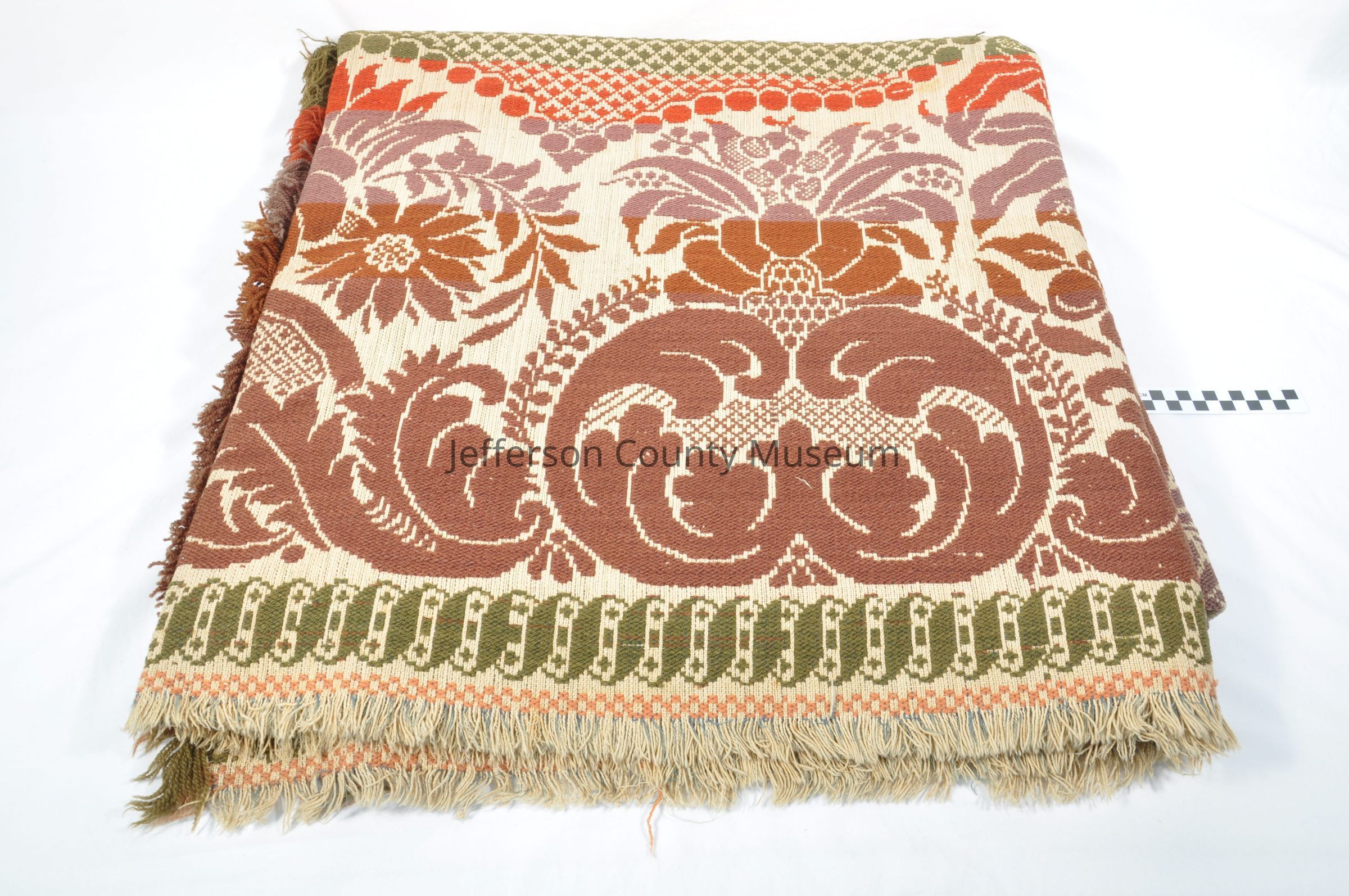 Thick Jacquard woven wool coverlet, brown, green, red and beige organized around a central rectangle design.Acquisition