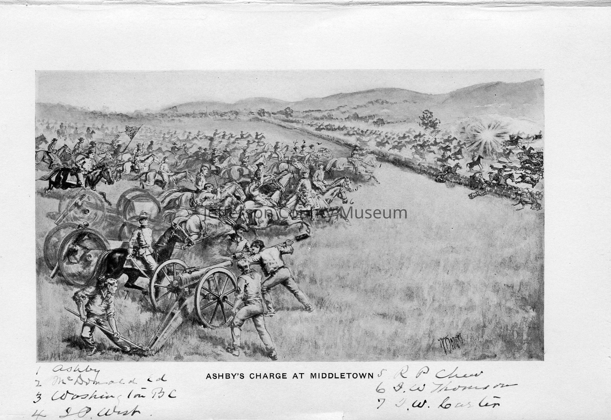 Green hardback book "A HISTORY OF THE LAUREL BRIGADE - ASHBY'S CAVALRY" by Captain William N. McDonald - 1907. Published by Mrs. Kate S. McDonald. Signature of "R P Chew" inside front cover. Illustration between pp. 60 and 61 ("Ashby's Charge at Middletown") has handwritten identifications of some of the individuals in the illustration.