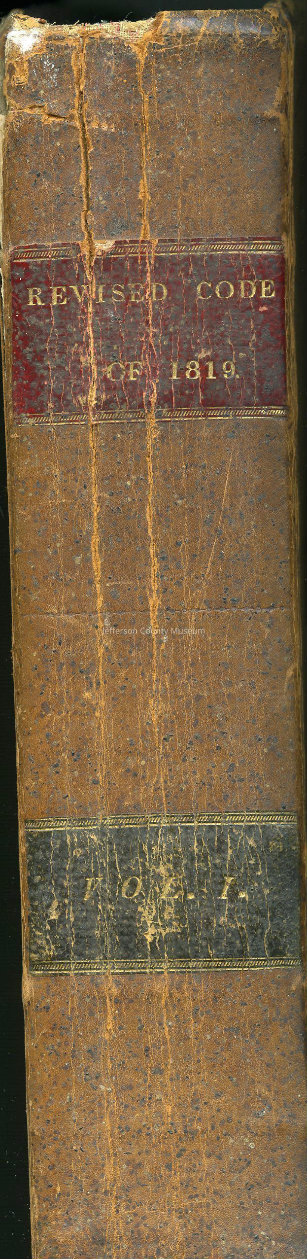 "The Revised Code OF THE LAWS OF VIRGINIA". Volume I, Richmond, Virginia, 1819. Printed by Thomas Ritchie. On spine in red leather "REVISED CODE OF 1819". Near bottom in black leather "VOL. I".