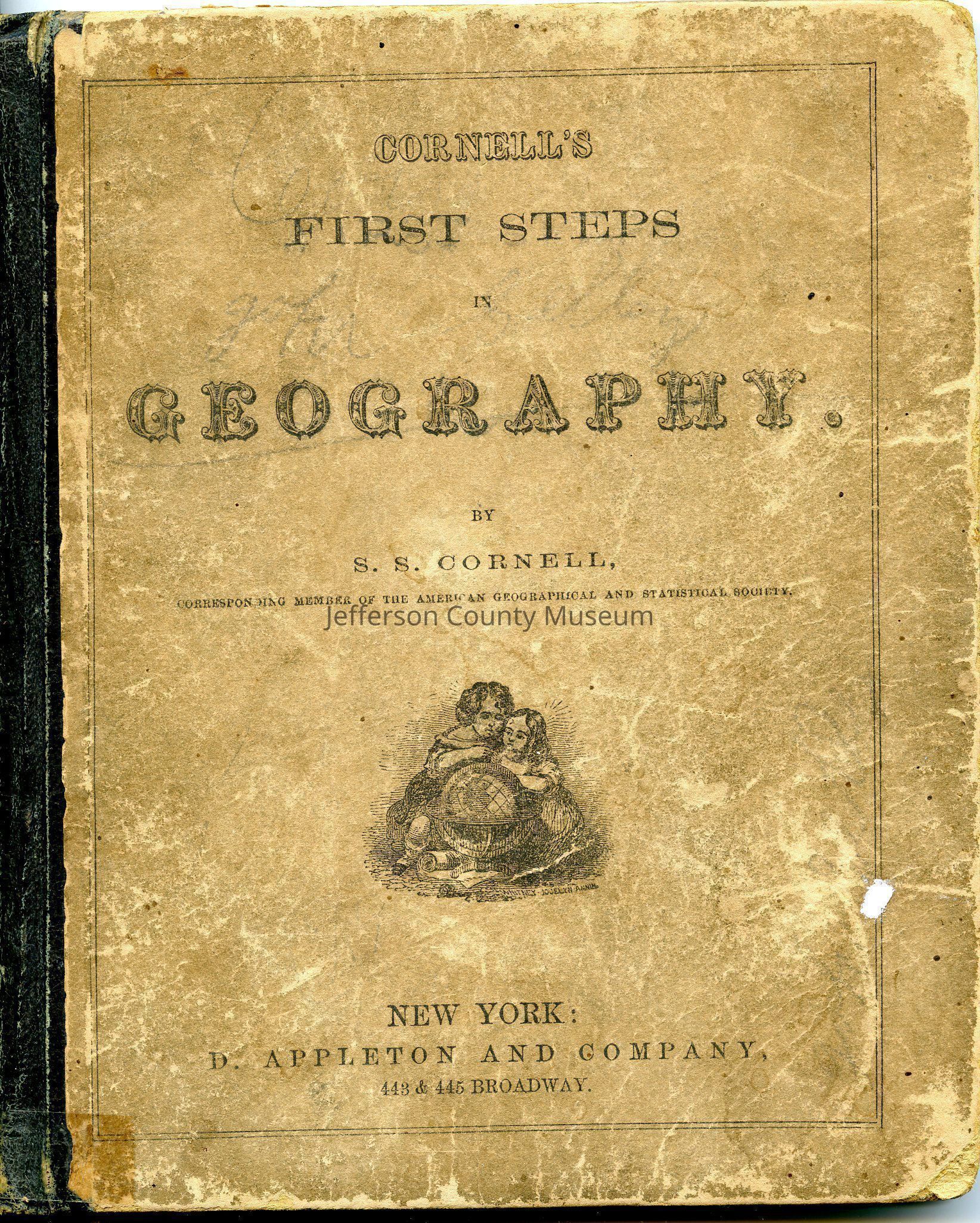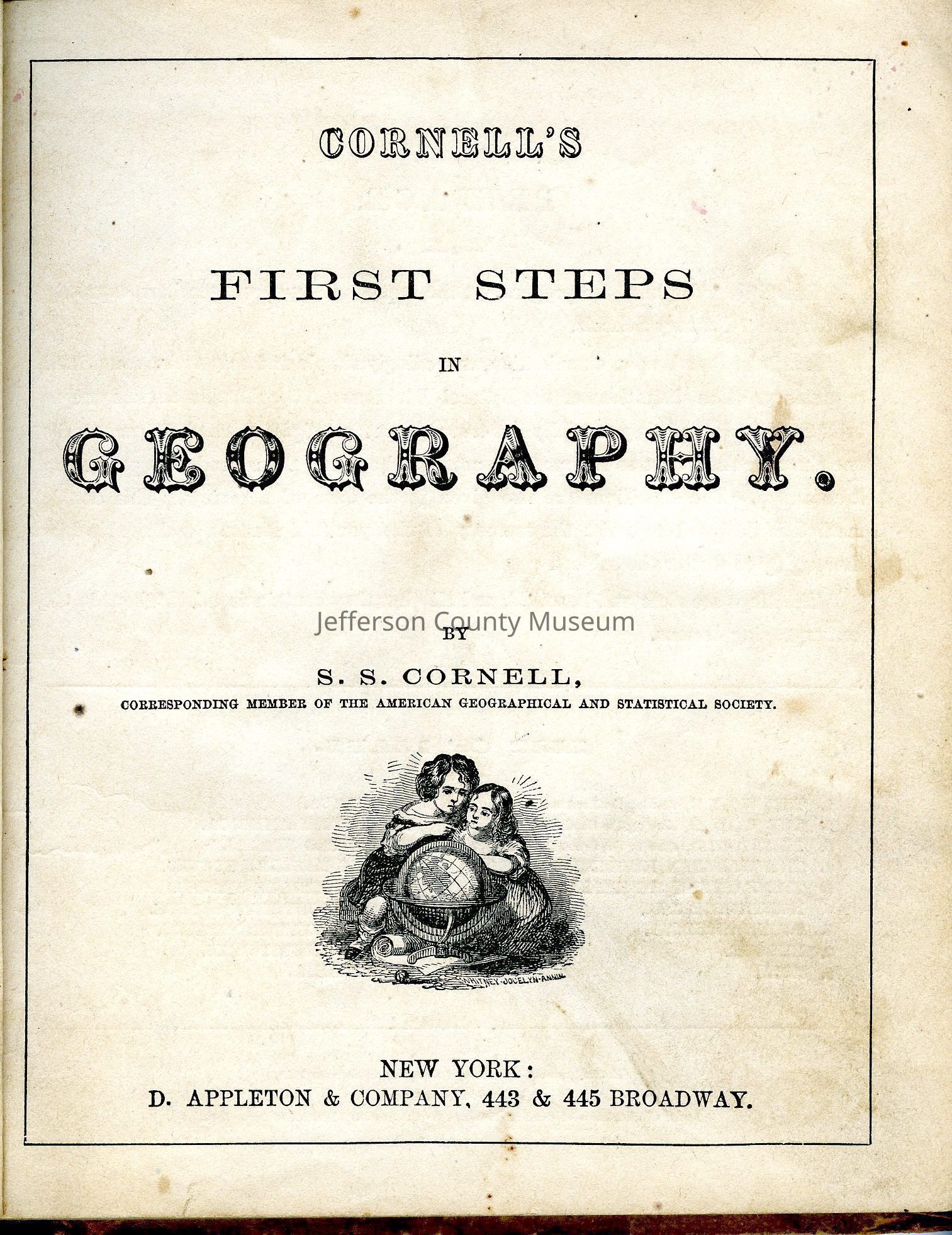Hard back book. On cover "CORNELL'S FIRST STEPS IN GEOGRAPHY BY S.S. CORNELL NEW YORK: D. APPLETON AND COMPANY 443 & 445 BROADWAY". Written inside front cover in brown ink "Master J. W. Selby. Feb. 20th 1865 Balto. Md". Printed in 1858.Acquisition
