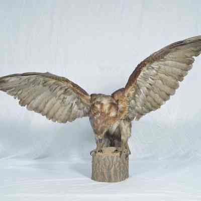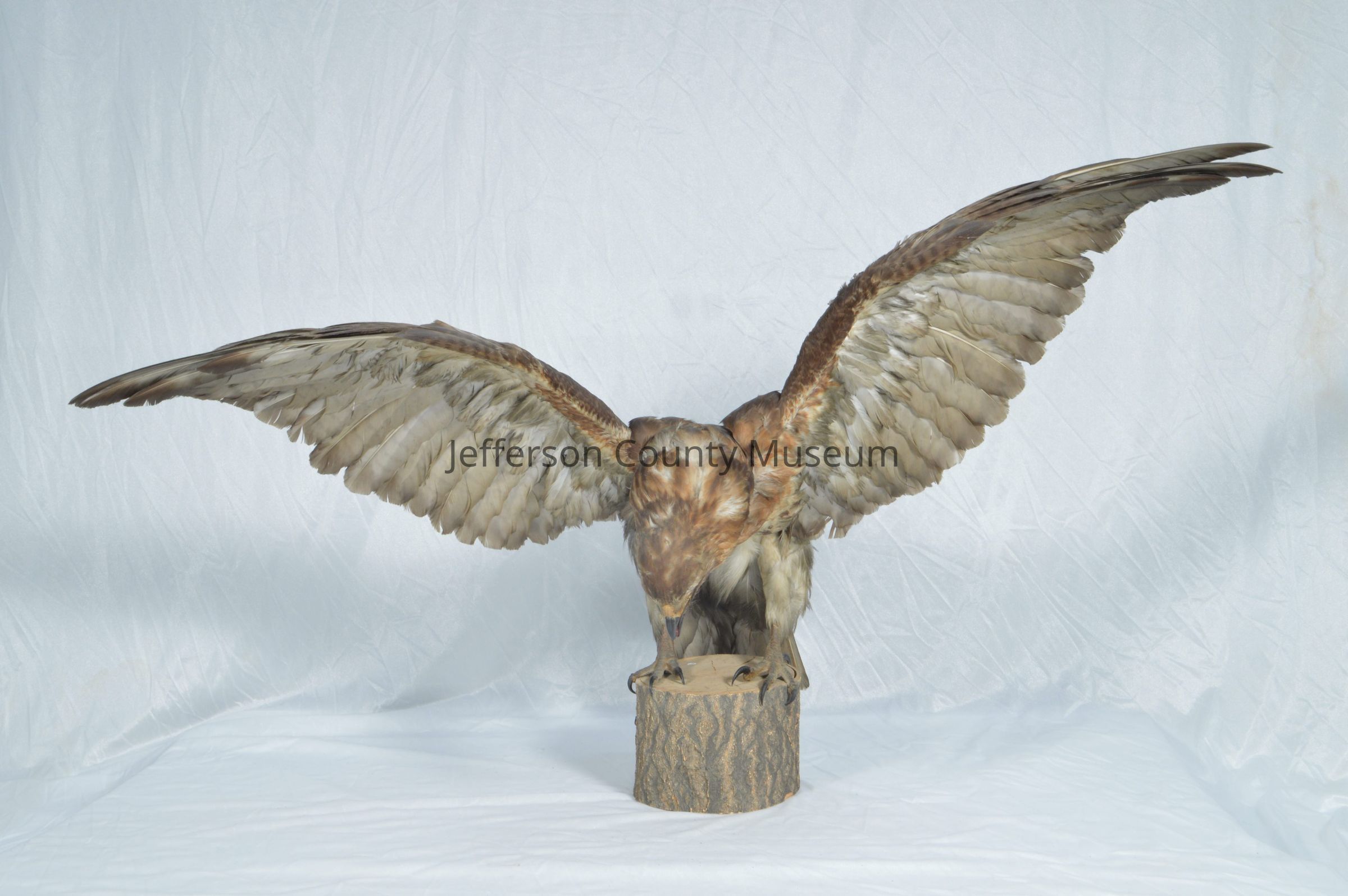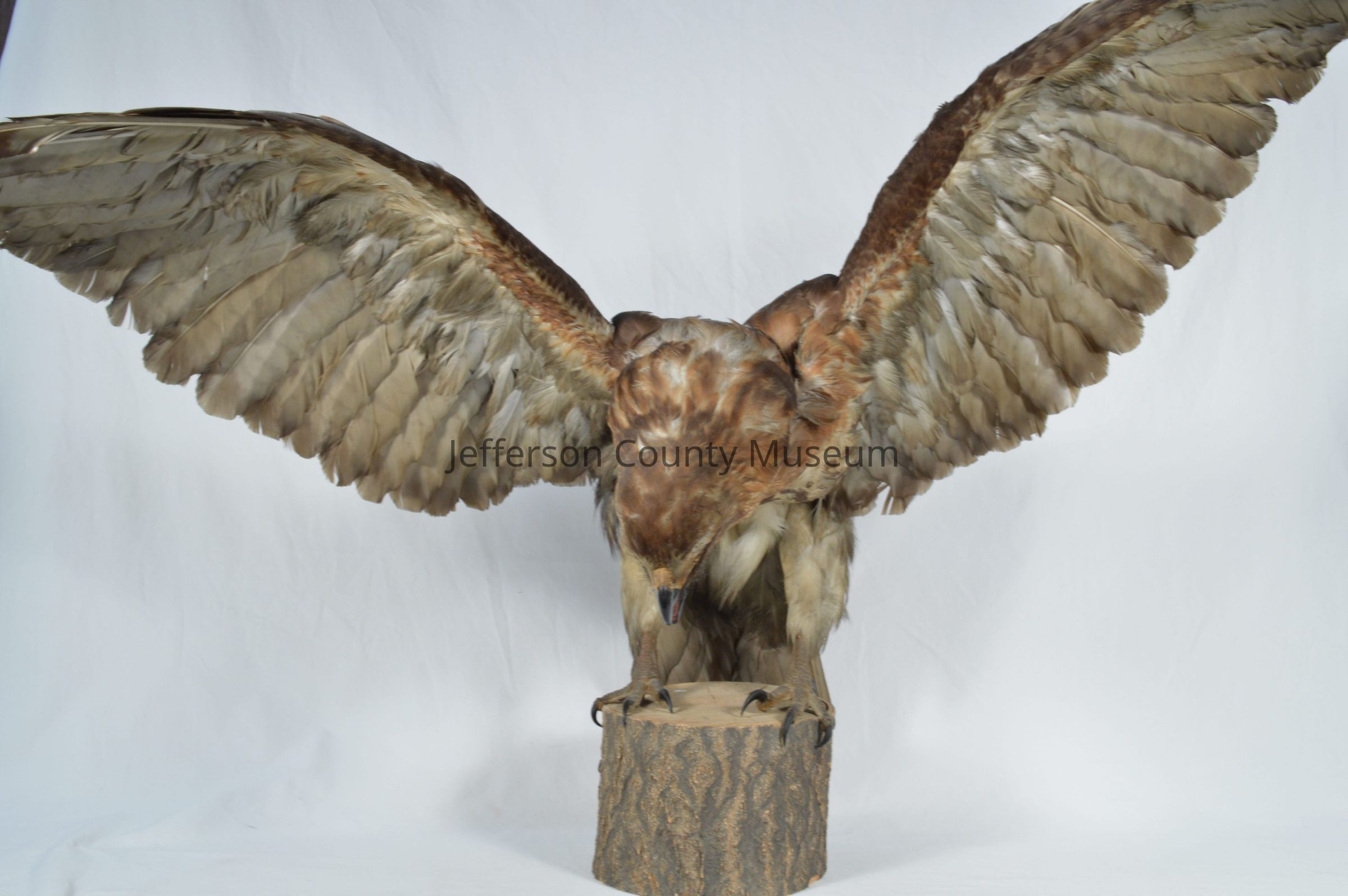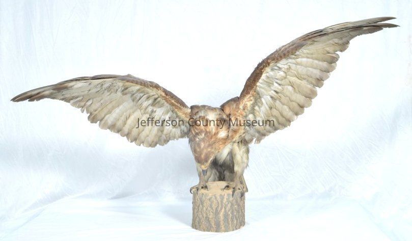 Mounted red-tail hawk with wings spread. Mounted on wood stump.