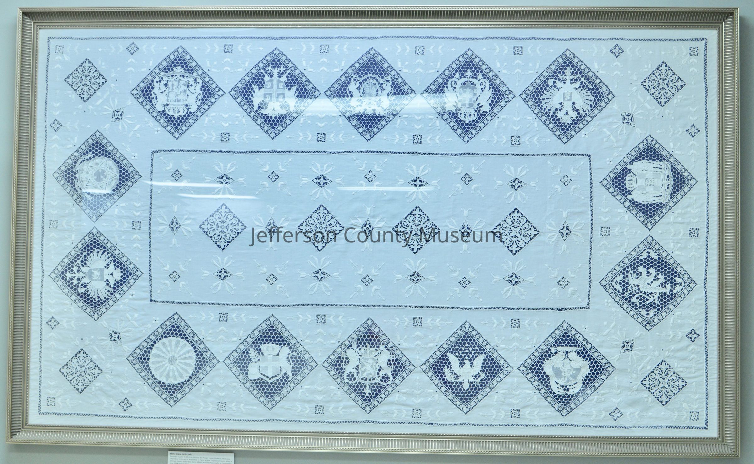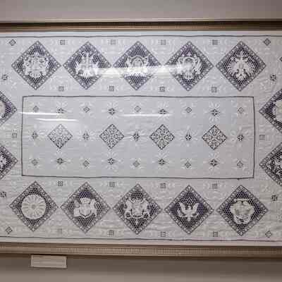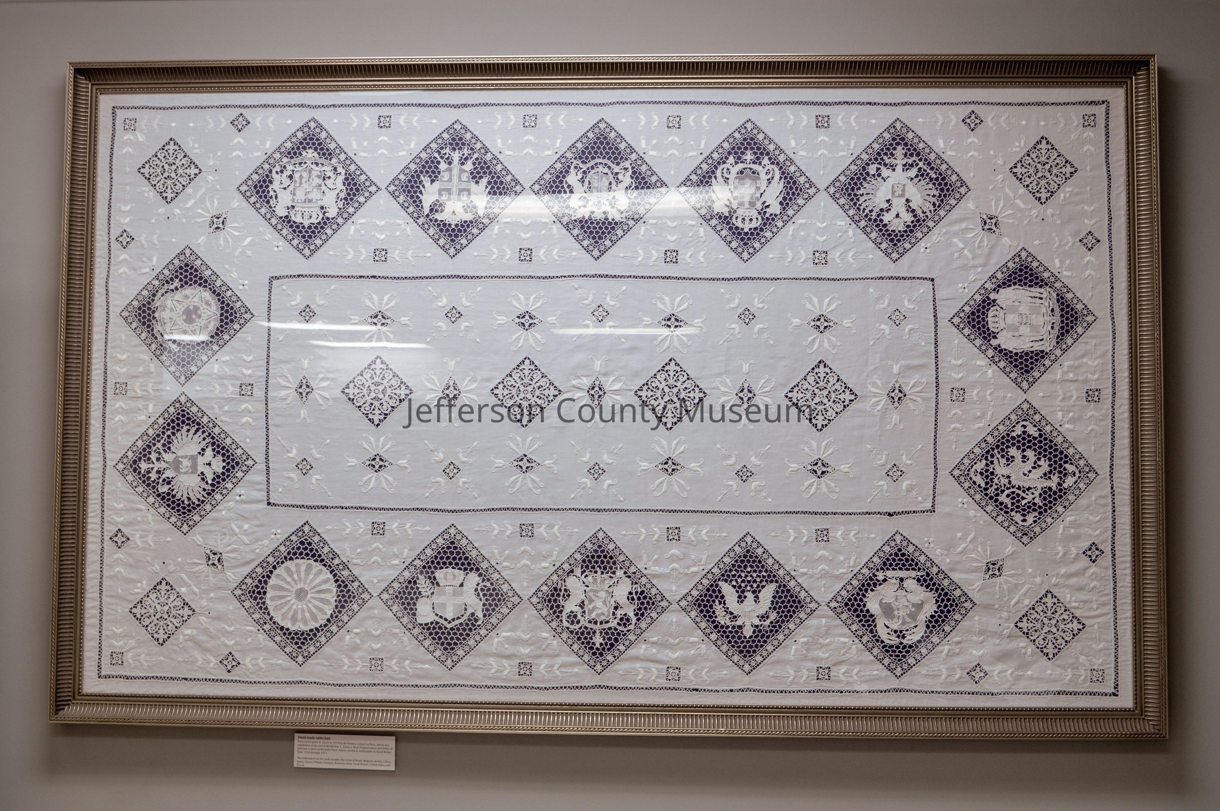 French linen and lace tablecloth framed behind glass. Presented to John W. Davis, Ambassador to Great Britain by the Plenary Council in Paris in 1919, set up at the end of World War I. Some countries identified by the crests are Brazil, Belgium, Serbia,, China, Japan, Greece, Poland, Portugal, Rumania, Siam, Great Britain, U.S.A., and Russia.Acquisition