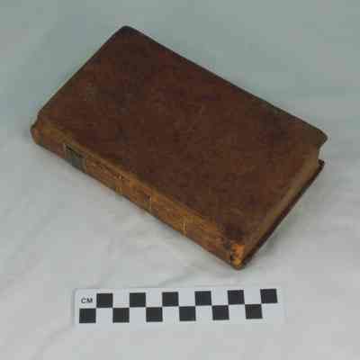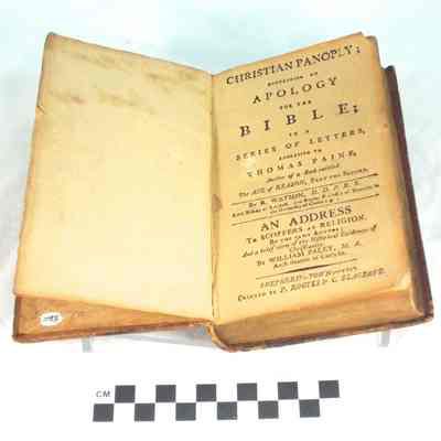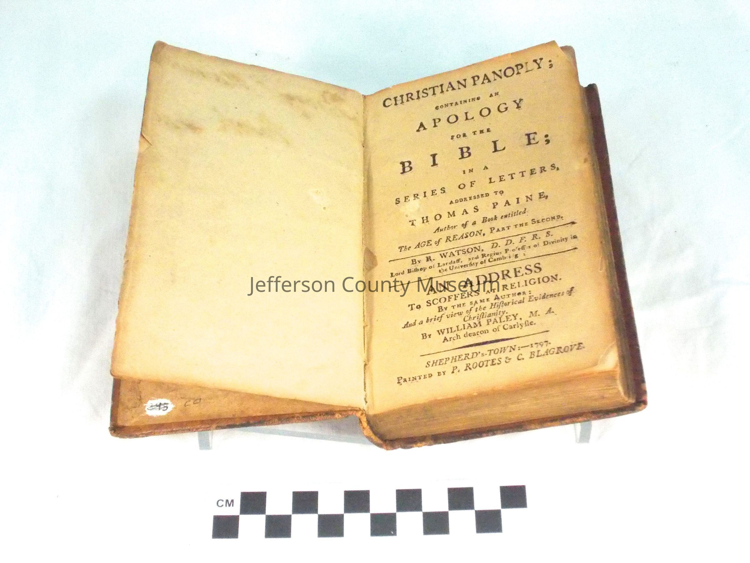 Leather bound book titled "CHRISTIAN PANOPLY" on spine. On front page "CHRISTIAN PANOPLY CONTAINING AN APOLOGY FOR THE BIBLE; IN A SERIES OF LETTERS, ADDRESSED TO THOMAS PAINE,......." By "R. WATSON, D.D.F.R.S.". Printed in Shepherdstown in 1797 by "P. ROOTES & C. BLAGROVE."Acquisition