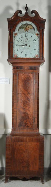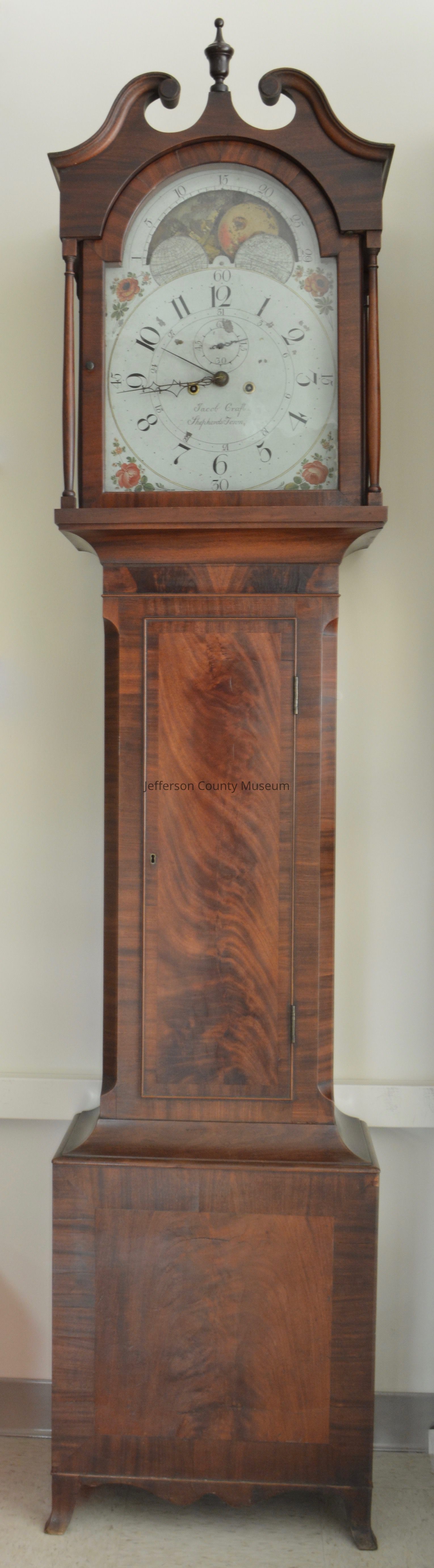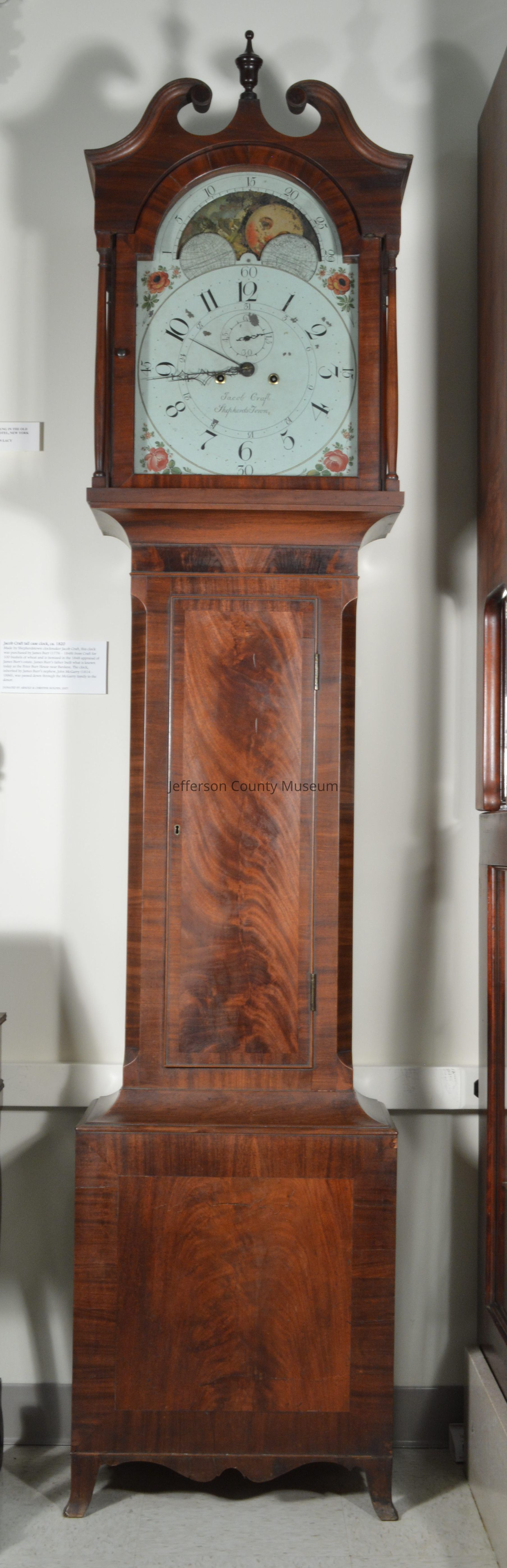 Mahogany and mahogany veneer tall case clock with broken-arch top with a central finial over an arched glass door with four turned columns, one on each corner of the hood. Enameled face is signed "Jacob Craft Shepherds Town". Clock made by Jacob Craft in Shepherdstown, West Virginia about 1820. James Burr purchased the clock from Craft for 100 bushels of wheat. Clock keeps track of seconds, hours, date and phases of the moon. Face has black numbers for seconds, hours and date. Numbers at top for phases of moon. Red rose with green leaves in each corner.Acquisition