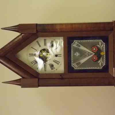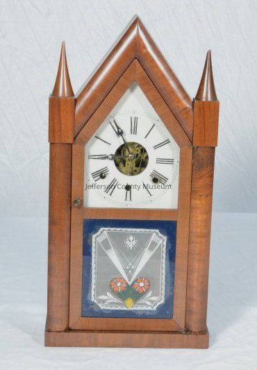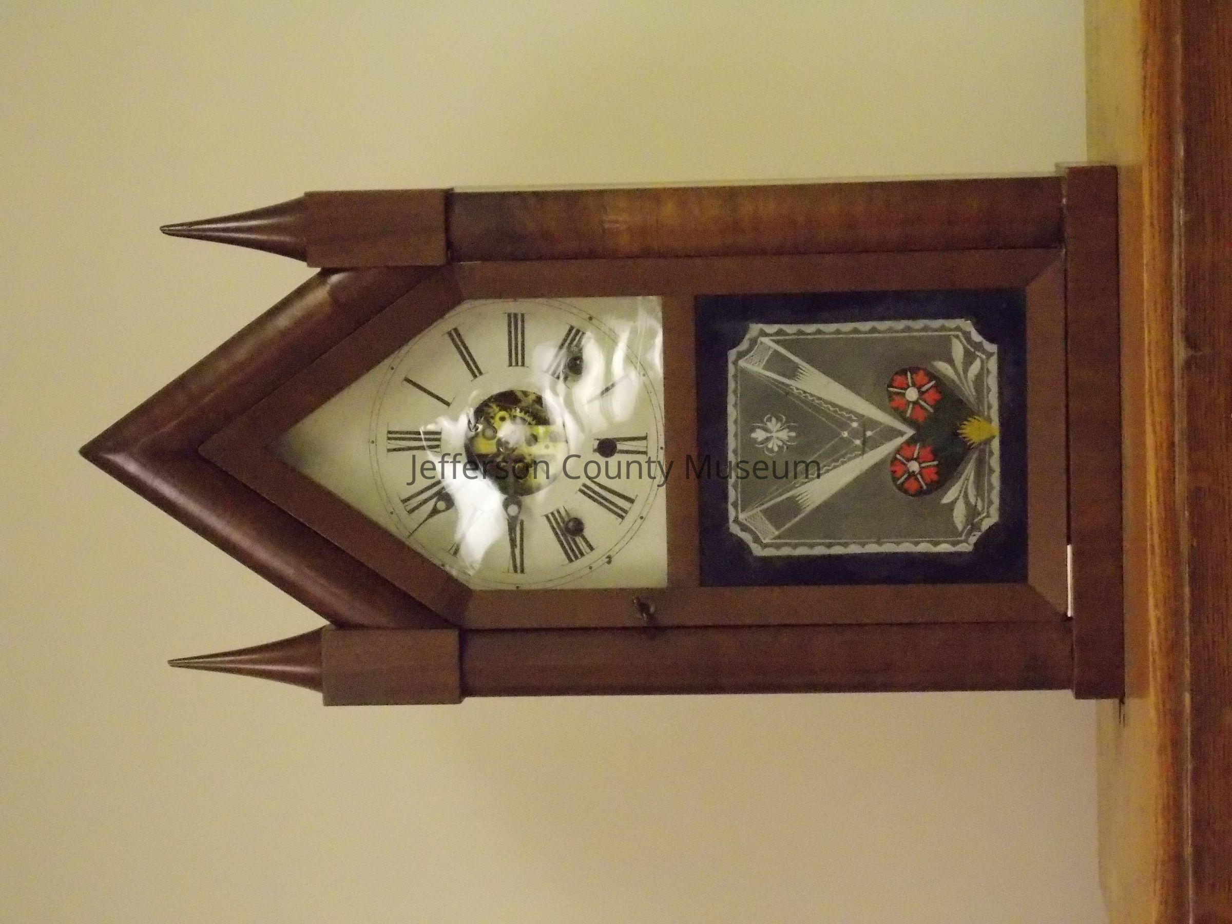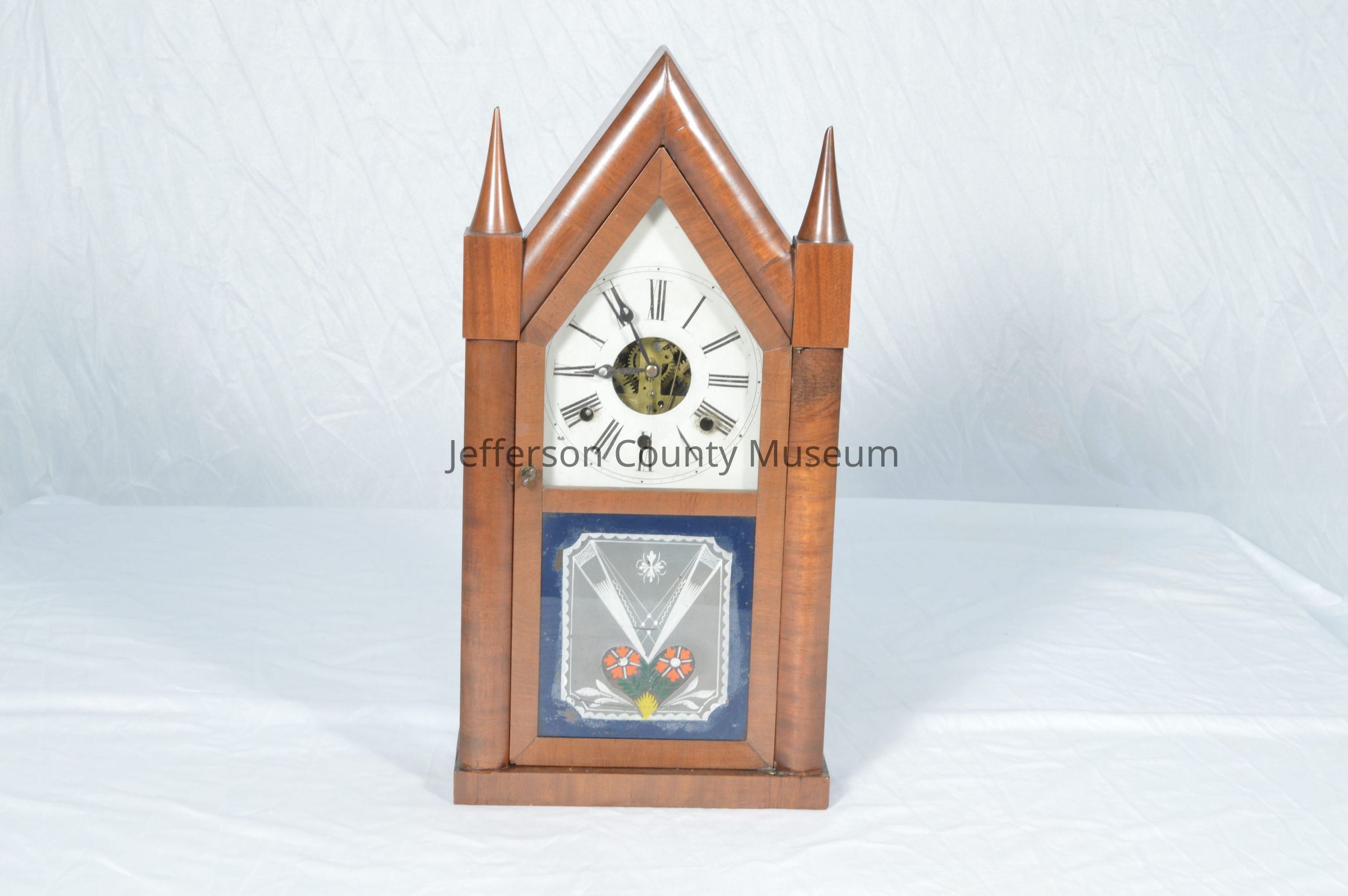 Walnut steeple style mantle clock. Face has Roman numerals. Bottom half of glass front painted with blue border, gray and white and heart and flowers design in orange, green and yellow. Inside "WM. S. JOHNSON No. 20 COURTLANDT ST., N.Y.". Directions for regulating clock also inside. Oval paper label on back "O.A. DOHN SO. ORANGE, N.J. JEWELER". Written in pencil in center of oval "11/27/23".