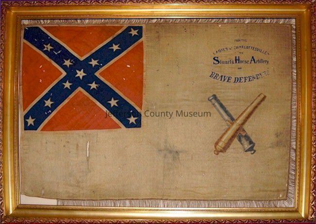 Second National Flag of Confederacy given to Stuart's Horse Artillery after the battle of Rio Hill near Charlottesville, Virginia. Gold fringe around flag. In top right corner above crossed cannons "FROM THE LADIES of CHARLOTTESVILLE, VA. TO Stuart's Horse Artillery OUR 'BRAVE DEFENDERS' ". In ornate gold leaf frame.Acquisition